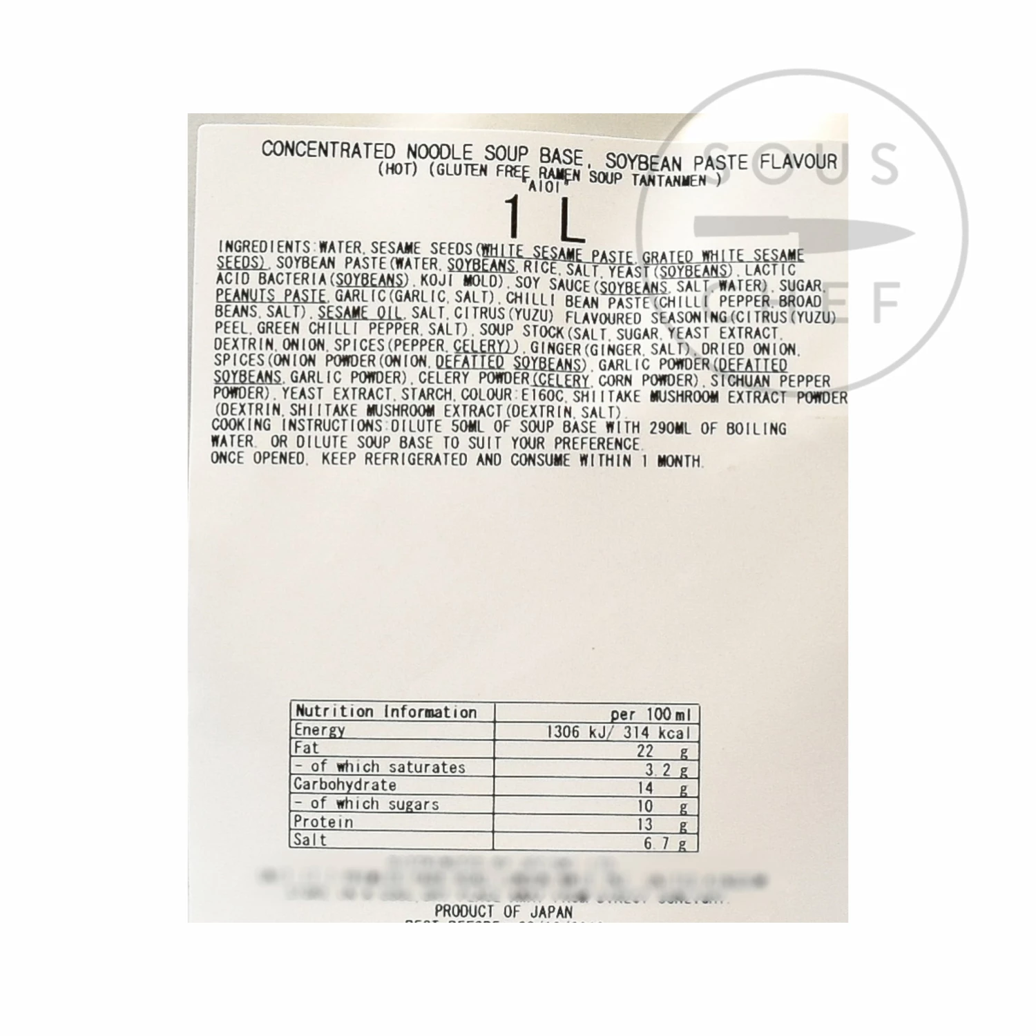 Ingredients: water sesame seeds (white sesame paste, grated white sesame seeds), soybean paste (water, soybeans, rice, salt, yeast (soybeans), lactic acid bacteria, koji), soy sauce (soybeans, salt, water), sugar, peanut paste, garlic (garlic, salt), chilli bean paste (chilli pepper, broad beans, salt), sesame oil, salt, citrus (yuzu) flavoured seasoning (yuzu) (citrus peel [yuzu], green chilli pepper, salt), soup stock (salt, sugar, yeast extract, dextrin, onion, spices [pepper, celery]), ginger (ginger, salt), dried onion, spices (onion powder [onion, deatted soybeans], garlic powder [defatted soybeans, garlic powder], celery powder [celery, corn powder], Sichuan pepper powder), yeast extract, starch, colour: E160C, shiitake mushroom extract powder (dextrin, shiitake mushroom extract [dextrin, salt]). Contains allergens: soya, sesame, peanuts, celery.Â