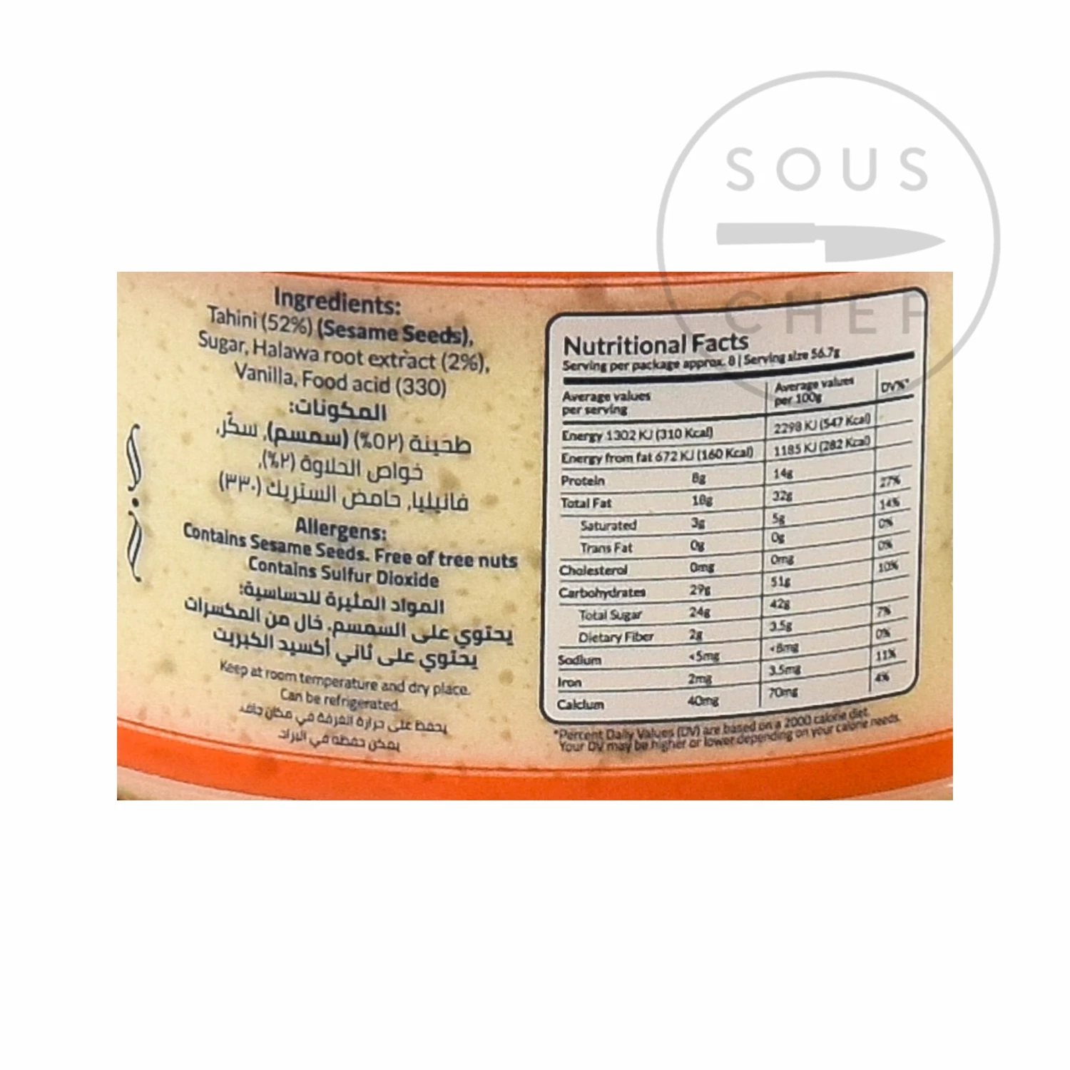 Ingredients: tahini (52%) (sesame seeds), sugar, halawa root extract (2%), vanilla, food acid (E330). Contains sulphur dioxide. Allergens are listed in bold.