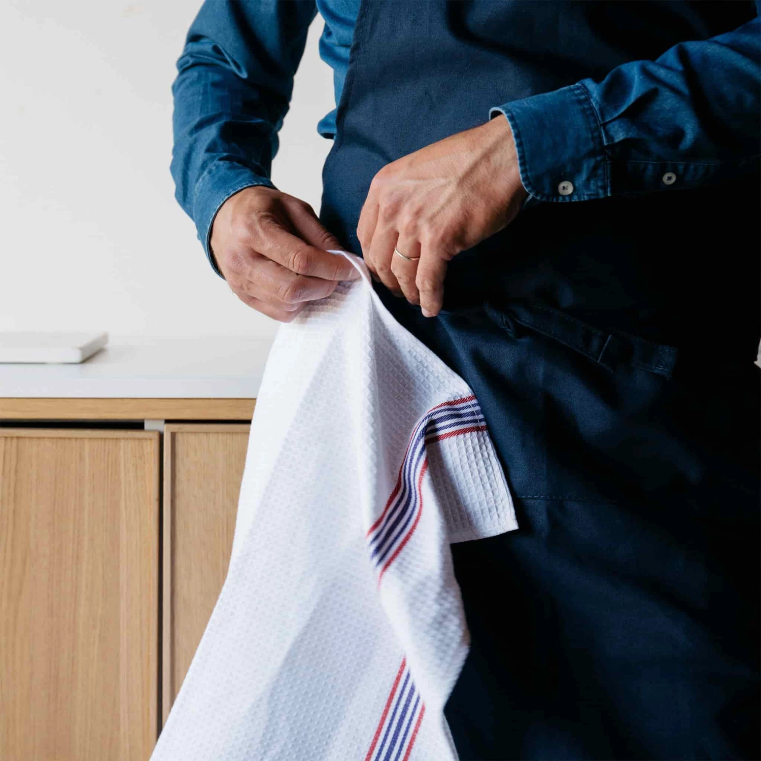Andree Jardin’s cotton hand towel for aprons is a large cloth, measuring 50x50cm. It’s the perfect thing to tuck into the straps of your apron, for taking hot pans out of the oven, or wiping down small splashes and spills.