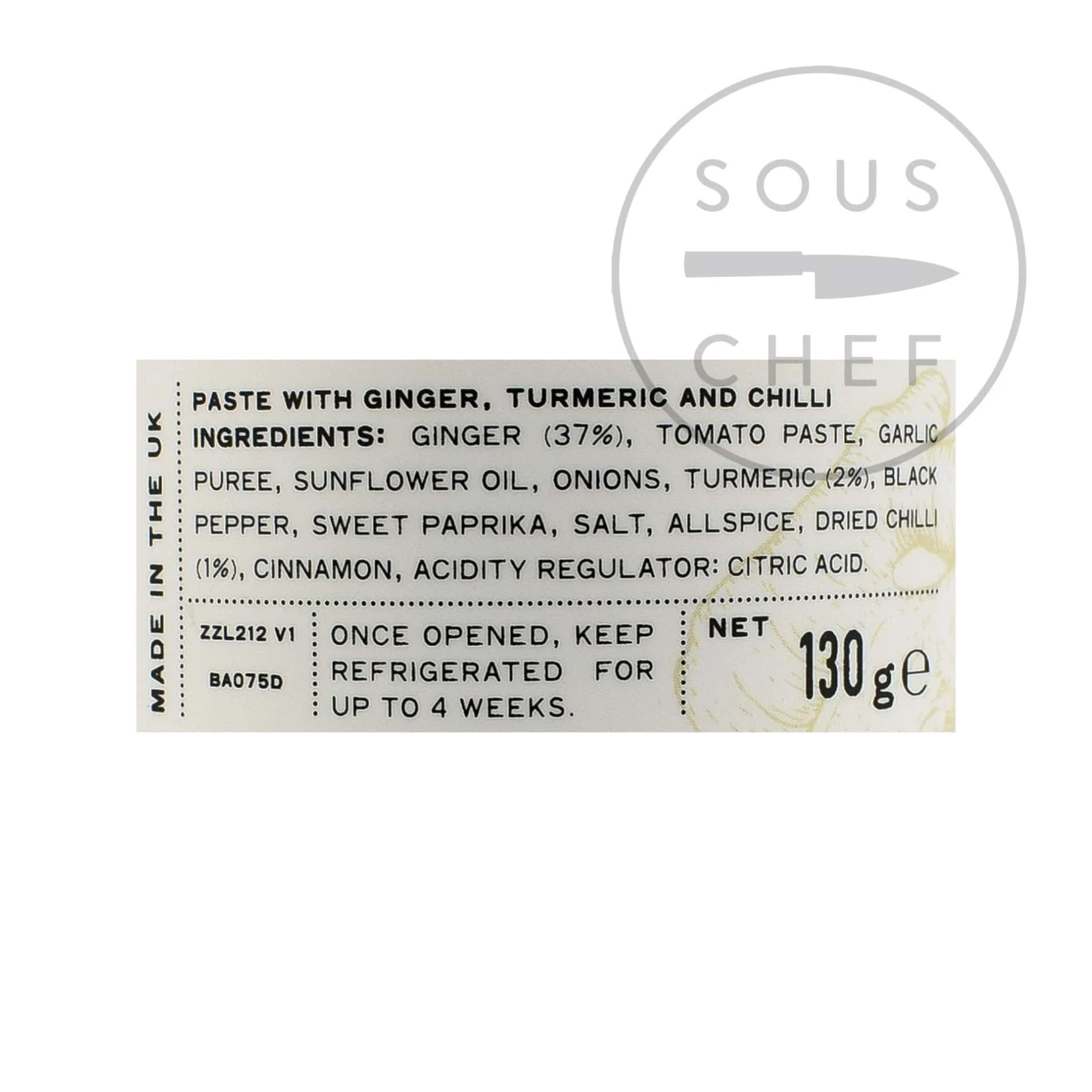 Ingredients: Ginger (37%), tomato paste, garlic puree, sunflower oil, onions, turmeric (2%), black pepper, sweet paprika, salt, allspice, dried chilli (1%), cinnamon, acidity regulator: citric acid.