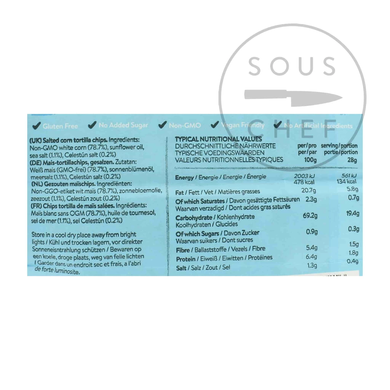 Ingredients: Non-GMO white corn (78.7%), sunflower oil, sea salt (1.1.%) celusten salt (0.2%).