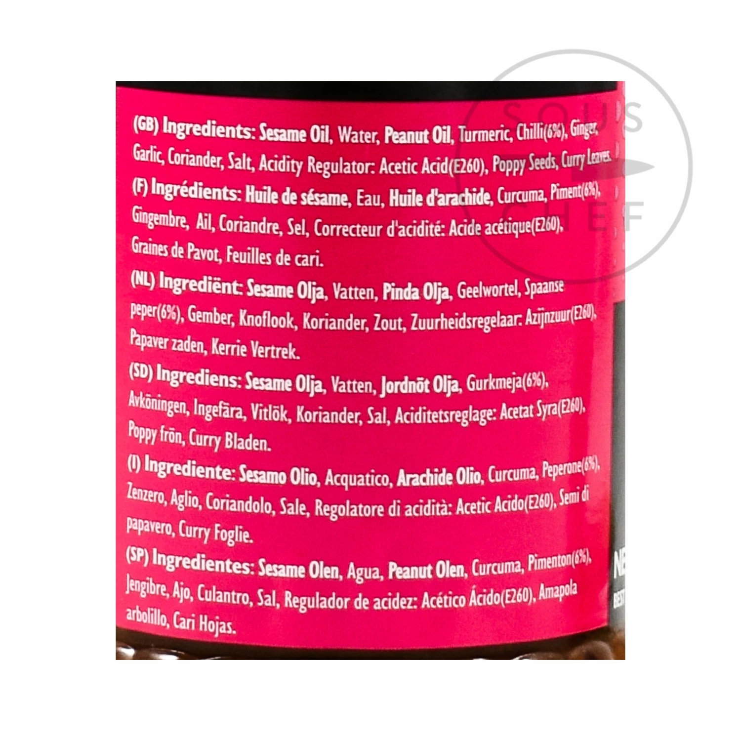 Ingredients: Sesame oil, water, peanut oil, turmeric, chilli (6%), ginger, garlic, coriander, salt, acidity regulator e260, poppy seeds, curry leaves. May contain sulphur dioxide. Allergens listed in bold.