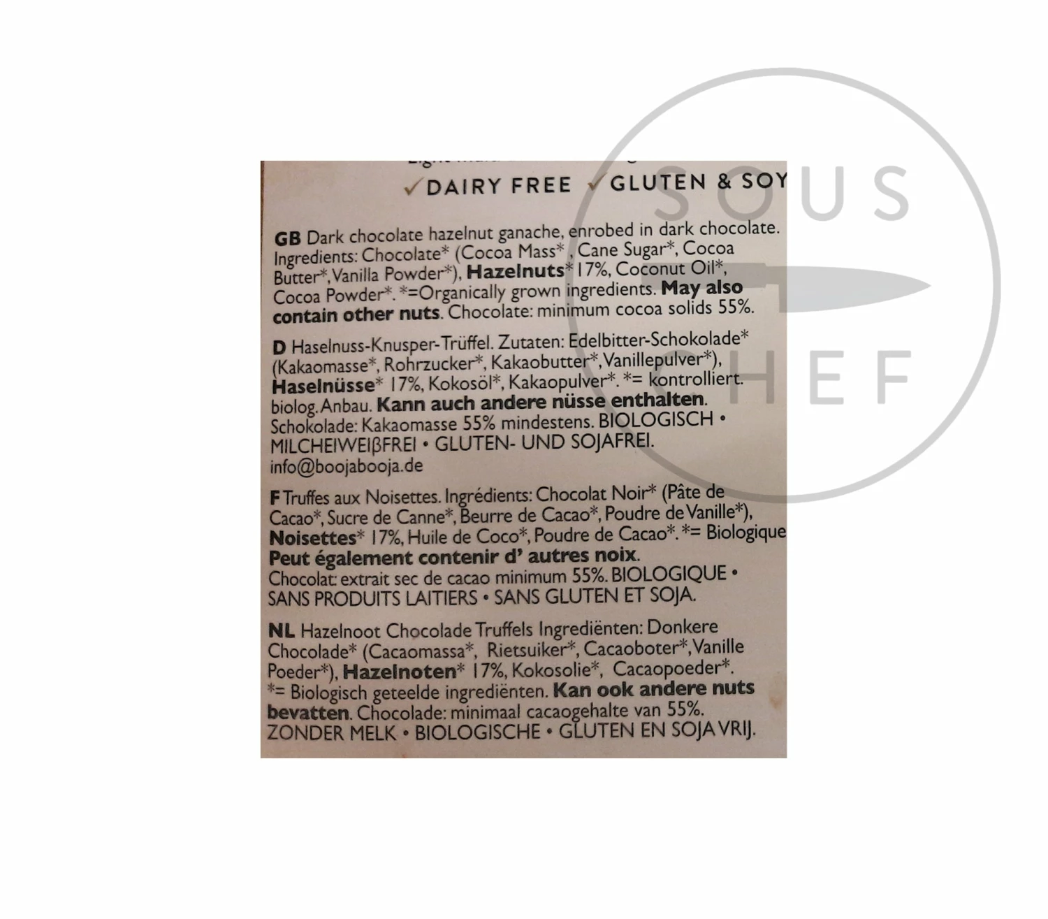 Ingredients: Chocolate* (cocoa mass*, cane sugar*, cocoa butter*, vanilla powder*), hazelnuts* 17%, coconut oil*, cocoa powder*. * = organically grown ingredient.
