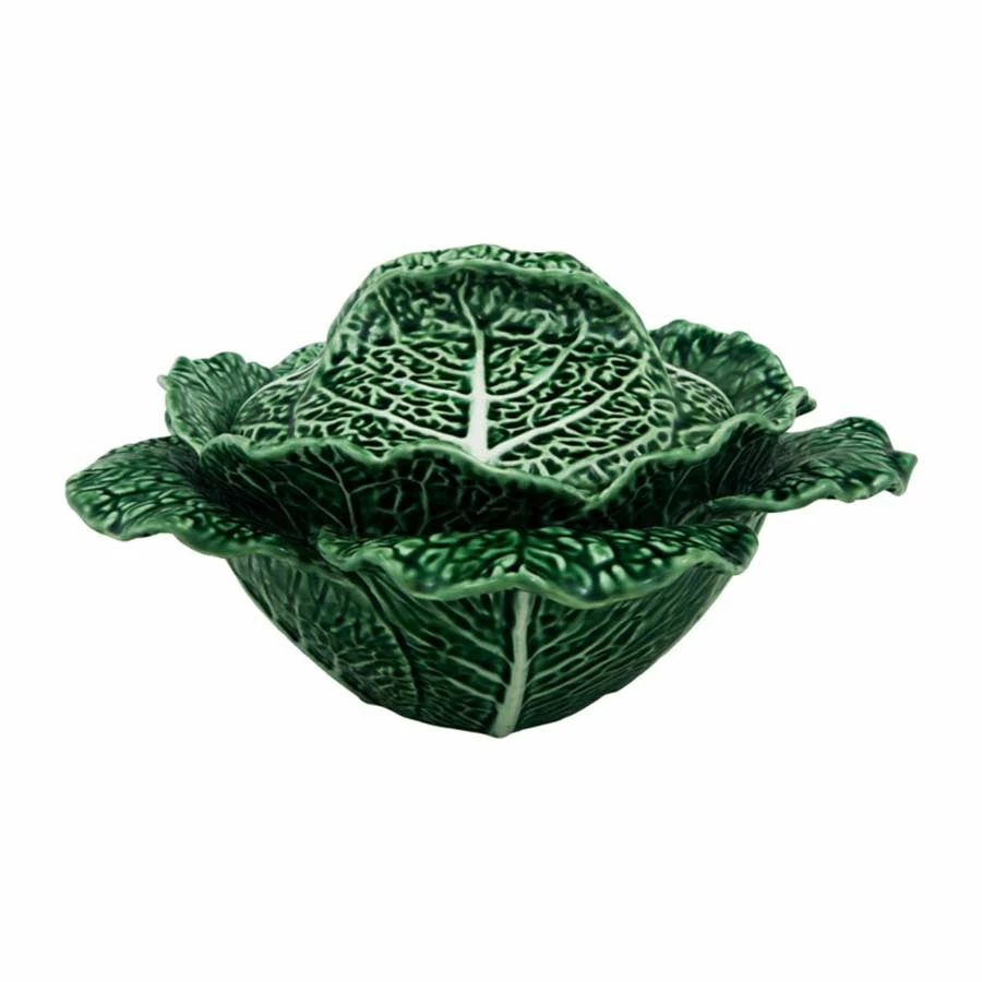 With the lid on, the hand-painted tureen resembles a large cabbage. The curling outer leaves not only add to the realistic look of the cabbage, but also act like handles to make it easier to carry. The earthenware tureen is from the highly collectible Portuguese ceramics studio, Bordallo Pinheiro.