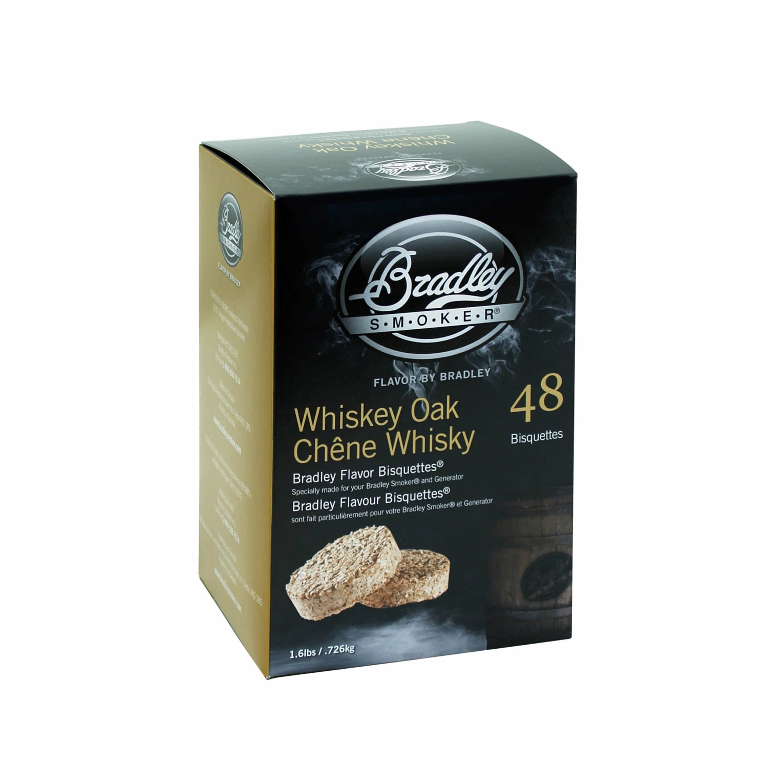 Bradley bisquettes were one of the first things to be developed when the Bradley family was trying to perfect their smoking technique. The unique bisquettes produce smoke that is four times cleaner than the smoke produced by burning traditional wood chips for food smoking. This means you get exceptional flavour– not to mention the fact that cleaner smoke means healthier smoked food. The burning of the bisquettes is controlled by the smoke generator – each bisquette burns for twenty minutes, then it is extinguished in a water pan and the next bisquette is automatically loaded for burning. This 48 pack of whiskey oak bisquettes provides 16 hours of smoking time.