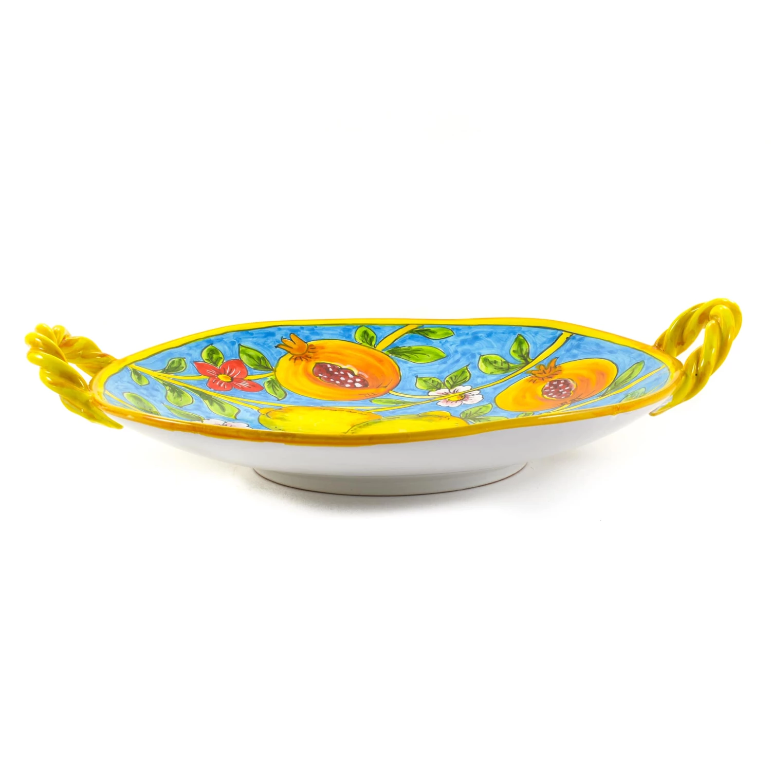 With bright shades of sunshine yellow, sea blue and pops of red, use this statement dish to display fresh fruit, sharing-style portions of pasta vongole, or panzanella salads. The twisted side handles are an extra detail that make this dish beautiful to look at, and carry.