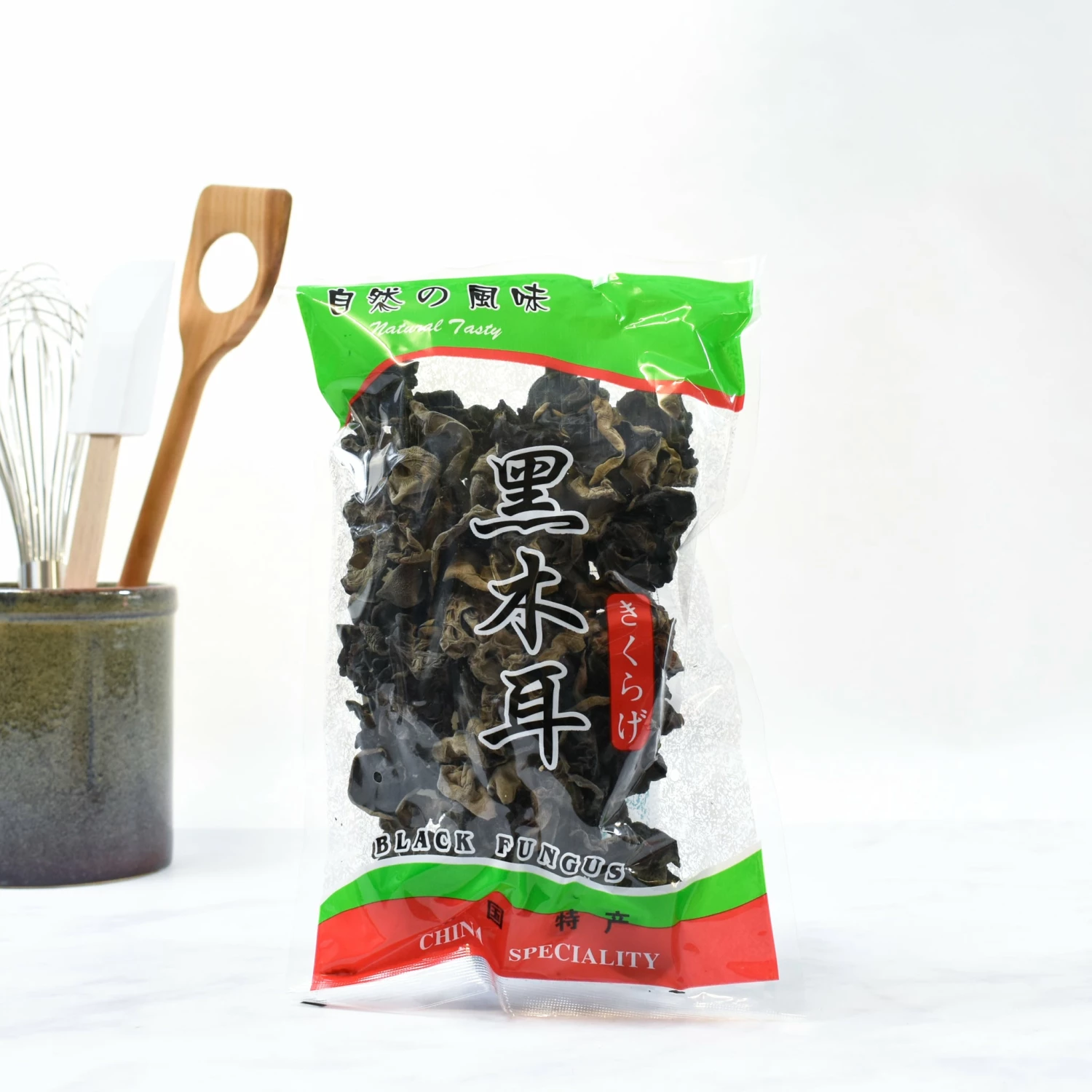 Dried cloud ear mushrooms, also known as black fungus or tree ear fungus, are an edible tree fungus grown in the western Chinese provinces of Hunan, Yunnan and Sichuan. They are gnarly and matt when dehydrated, but once soaked in water for twenty minutes – though longer is better – they expand into shiny, translucent clusters.