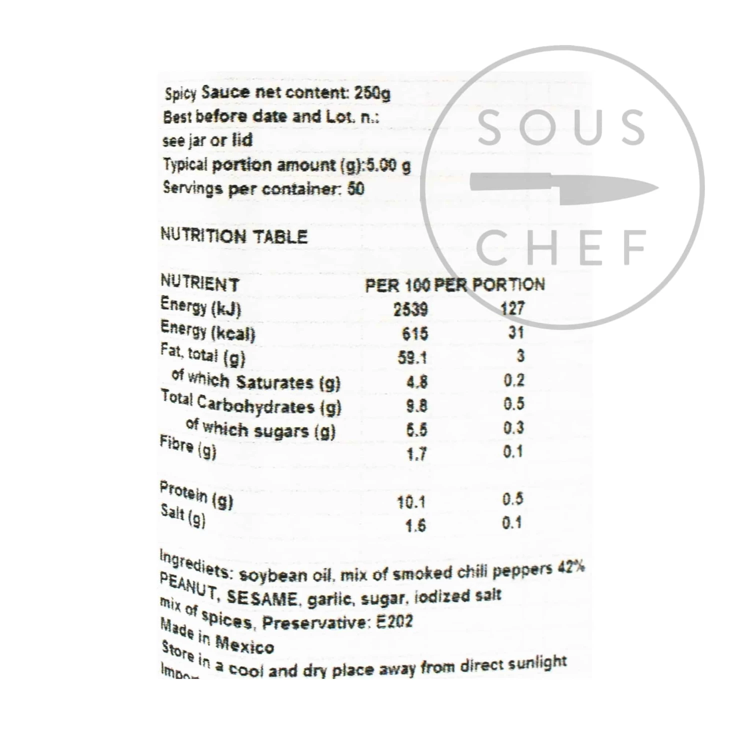 Ingredients: soybean oil, mix smoked chilli peppers 42%, peanut, sesame, garlic, sugar, iodized salt, mix of spices, preservative E202