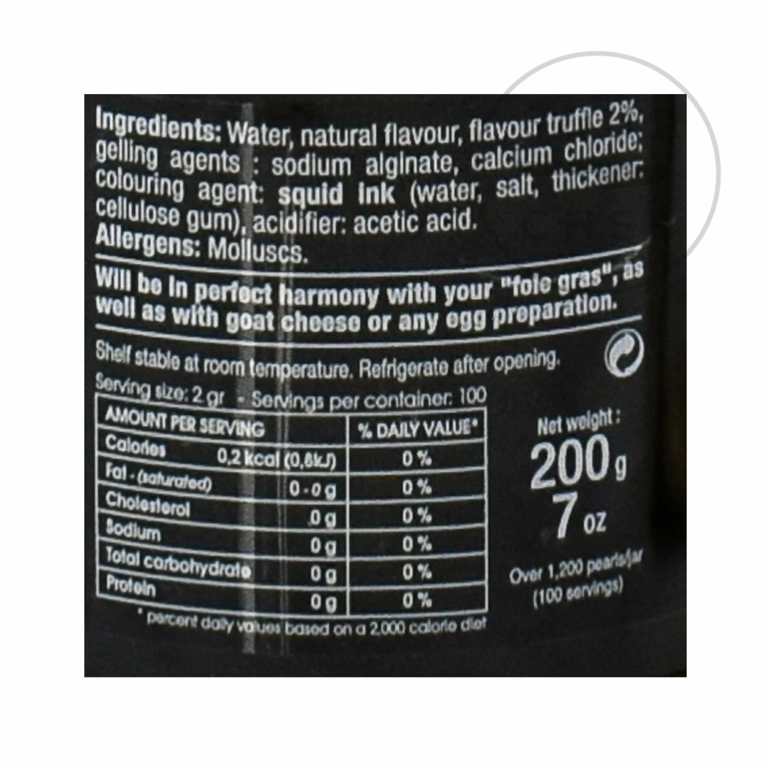 Ingredients: water, natural flavour (gluten), truffle flavour 2%, gelling agents: sodium alginate and calcium chloride; colouring: squid ink (squid ink, water, salt, cellulose gum), acetic acid.Â