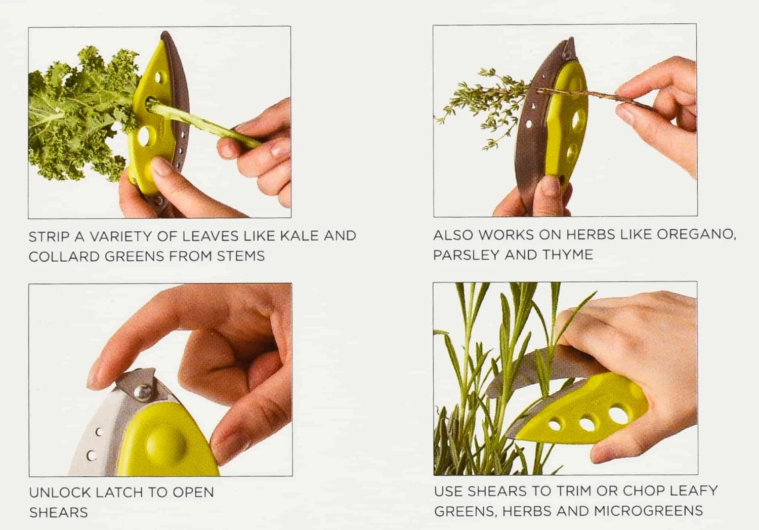 The Chef’n Kale and Herb Stripper allows you to separate the stems and leaves of your herbs in seconds! This tool has multiple size holes for use on larger leaves like kale and collard greens, as well as smaller herb stems, such as thyme and oregano. Gently push your stems through the cutter and watch the leaves easily detach. It also has a cutter attachment so you can harvest herbs from the plant and strip them, all in one handy device.