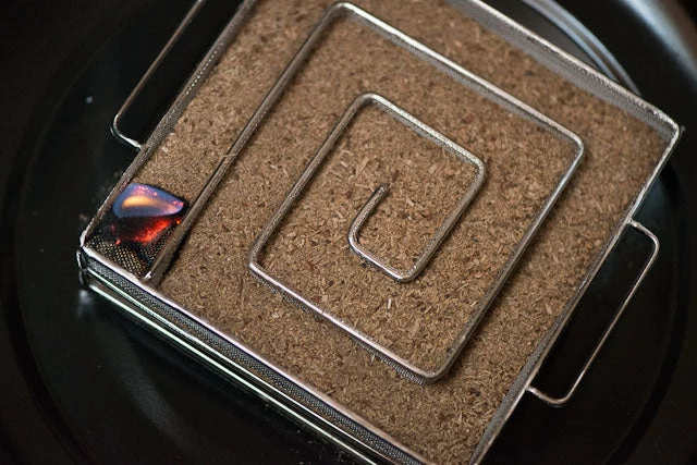 Next, fill the smoking tray with the oak wood dust, and light the corner. The smoke will wind its way through the maze over the course of ten hours, releasing a steady stream of smoke. Add spices or herbs, or use different flavoured wood dust to scent the smoke and pair it with specific foods. Try everything from haddock, to home-smoked salmon, bacon, brisket, ribs and cheeses.