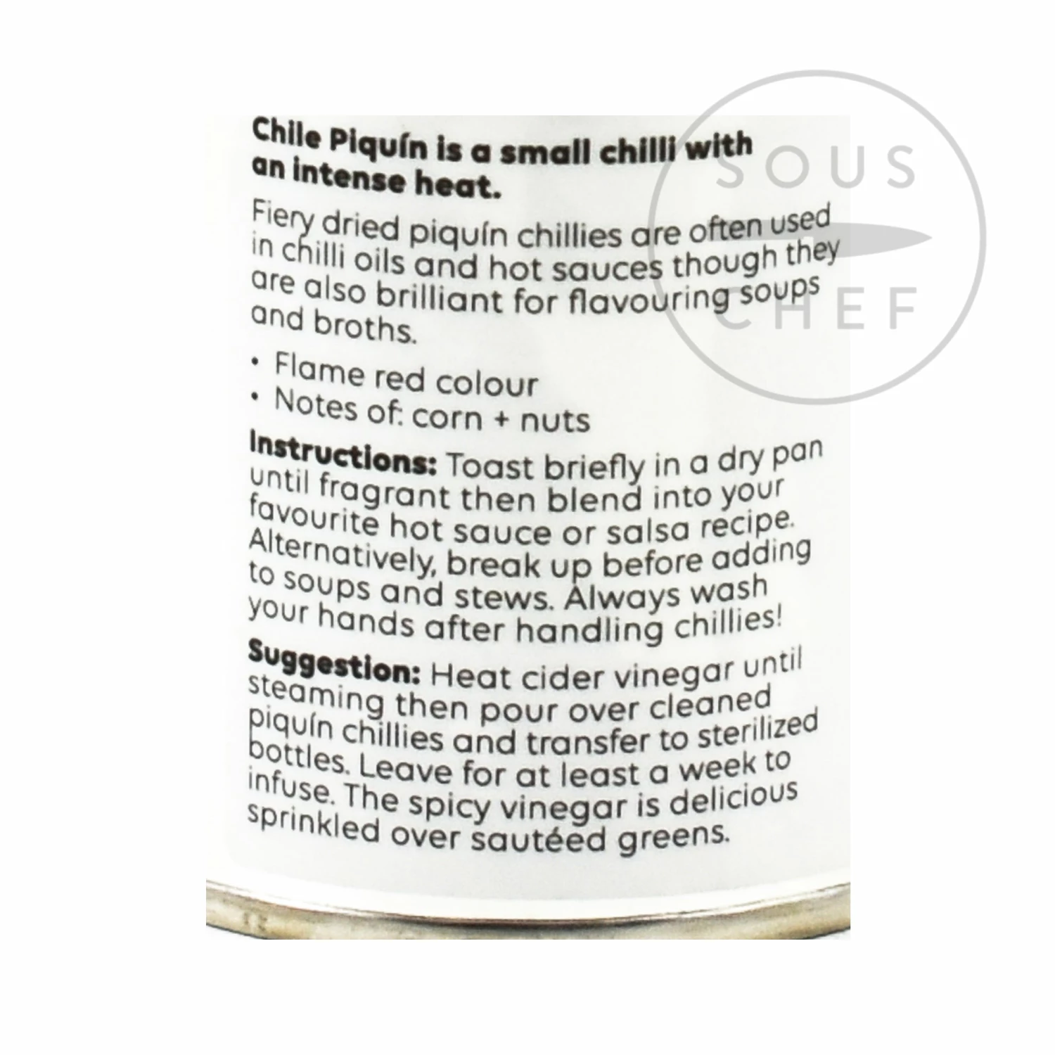 Piquin chillies have a citrus spiciness, and bitter chocolate notes. They add heat and depth to tomato sauces and red meat marinades – their size and strength also make them a good ingredient for infusing oils and vinegars.