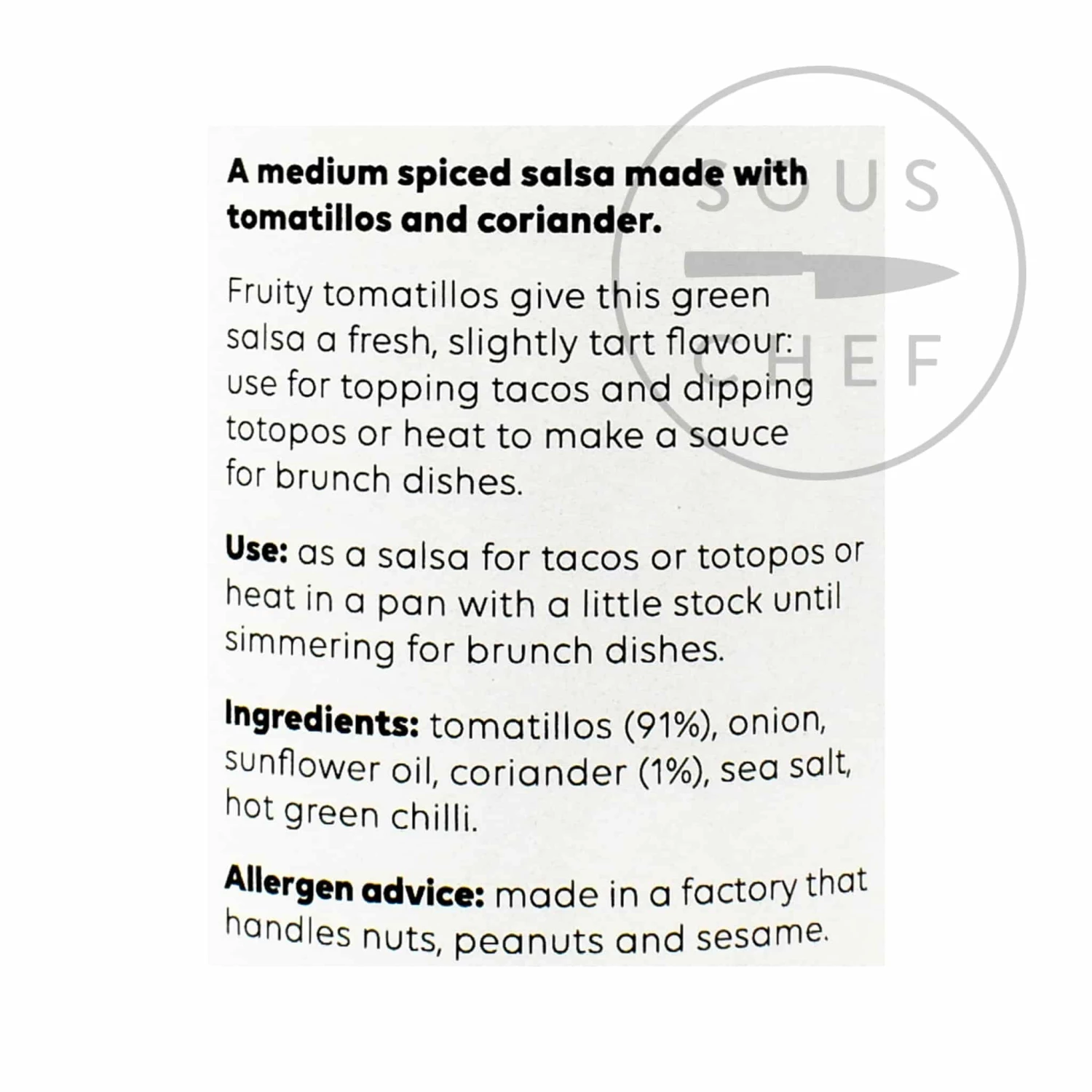 Ingredients: tomatillos (91%), onion, sunflower oil, coriander (1%), sea salt, hot green chilli.Â