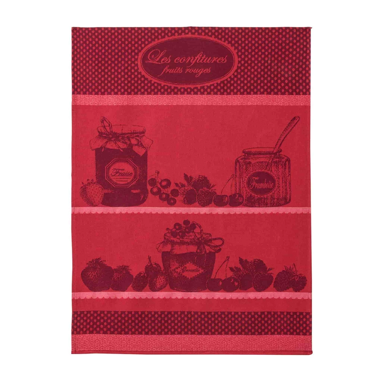 This French tea towel is emblazoned with all the accoutrements of jam-making, in dark cherry red colours. Made with 100% cotton jacquard, the towel is brilliantly absorbent and extremely hard-wearing. It looks good, and really dries the dishes in seconds. A great gift for any expert preservers!