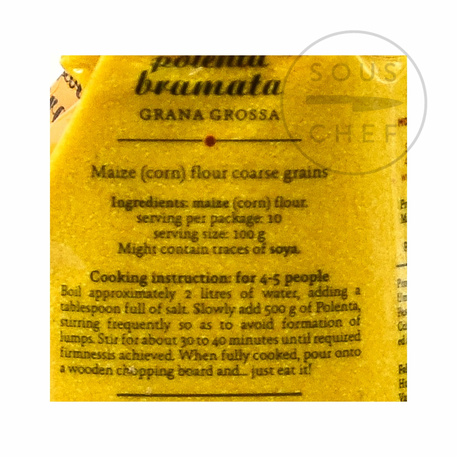 Cooking instructions for 4-5 people: Boil approx 2 litres of water, adding a tbsp of salt. Slowly add 500g polenta, stirring frequently for around 40-50 minutes until required firmness is achieved. Serve immediately.