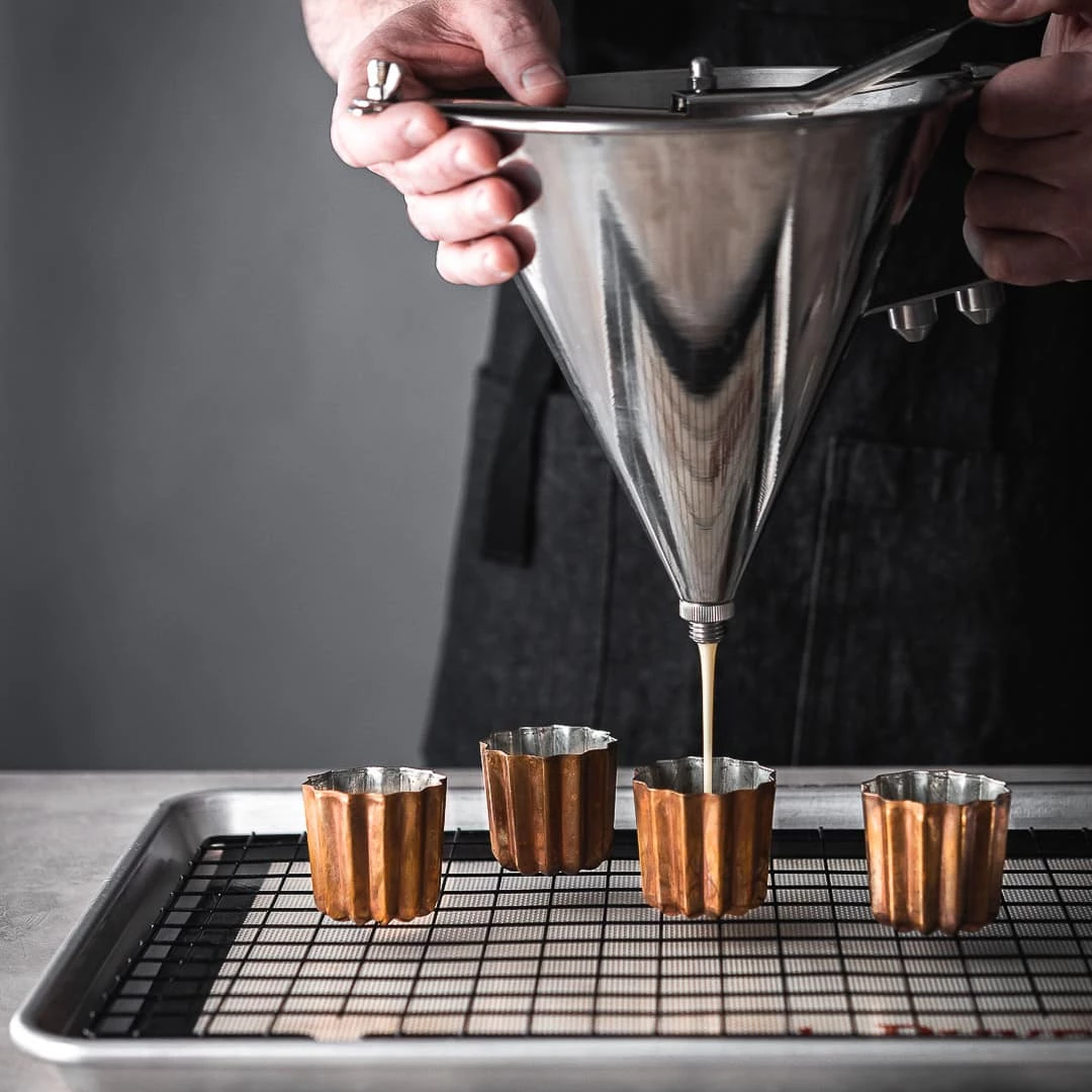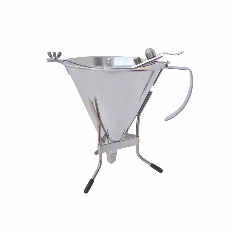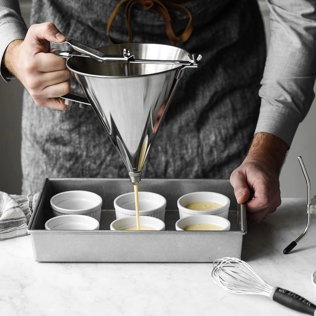 The De Buyer Kwik Pro piston funnel with stand lets you dispense precise amounts of cake batter, sauce or glaze quickly and easily – and with less mess.