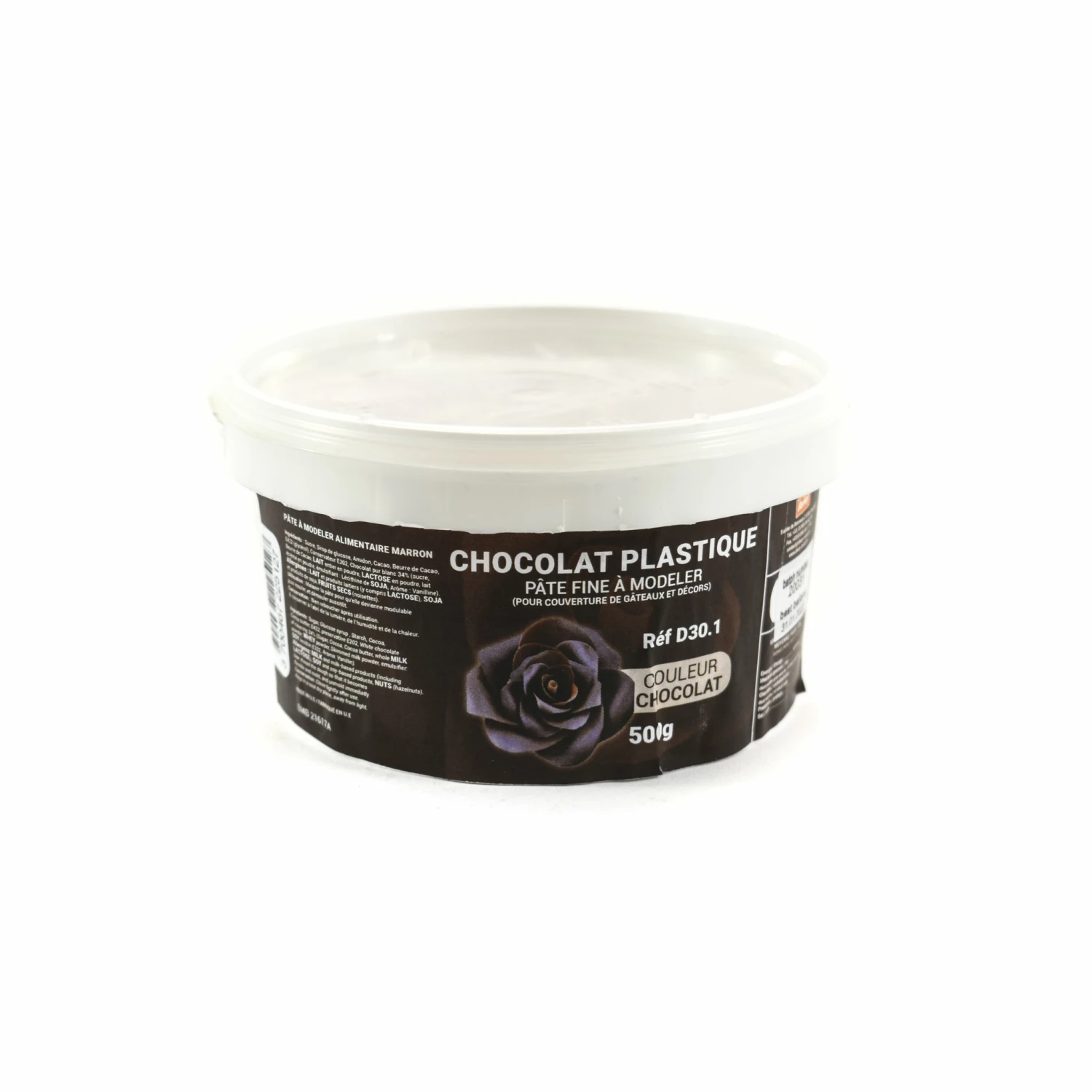 Chocolate plastique, or chocolate plastic, is used for moulding small decorations like chocolate roses to decorate cakes and patisserie. It can also be rolled out into a thin sheet to cover a cake or cupcakes. The chocolate flavour means the chocolate plastique is often used instead of sugar paste with chocolate cakes or desserts.