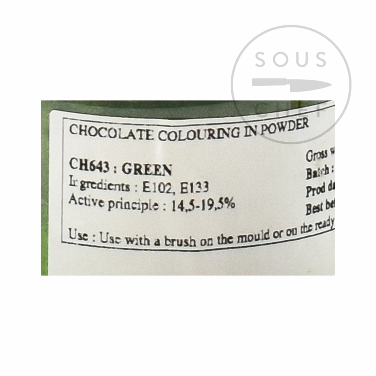 To use, mix the green chocolate colour together with melted white chocolate or cocoa butter melted at 35°C. Mix well and apply the coloured chocolate using a brush or chocolate spray gun. If using a spray, strain through a sieve before use. Use around 1tsp per 200g of chocolate or cocoa butter.