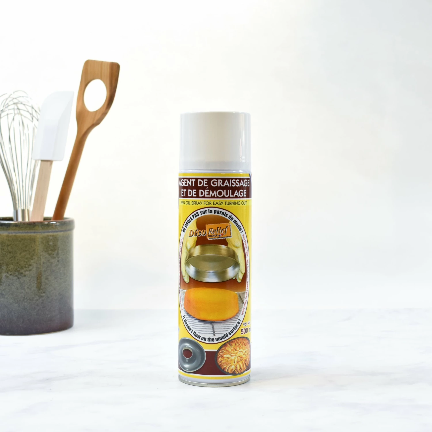 This professional baking spray, or greaseproof spray, instantly makes baking tins, metal moulds and frying pans non-stick. The can contains light yellow oil – flavourless and with no added water – perfect for baking, patisserie and confectionery.