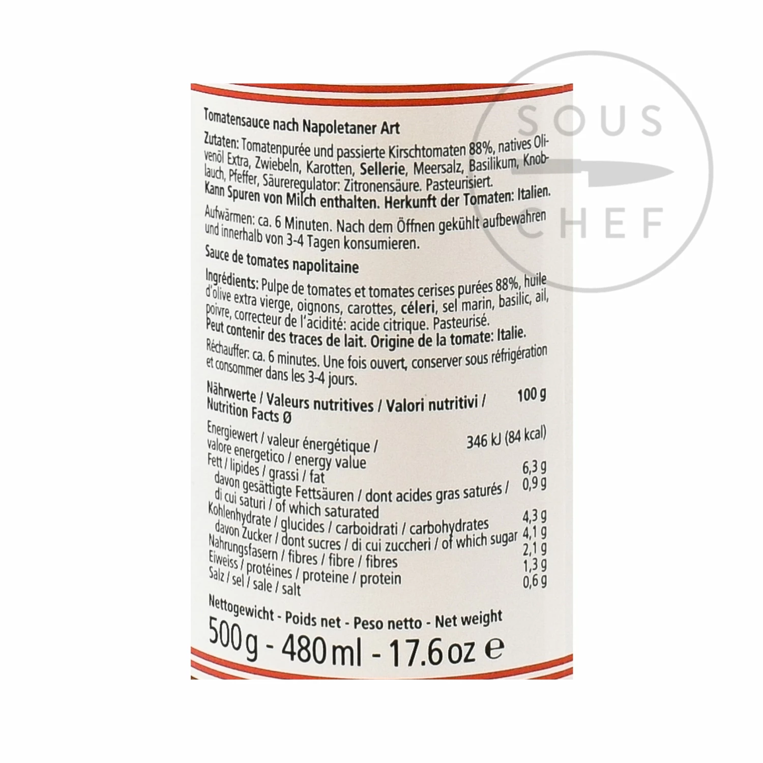 Ingredients: pulp of tomato and cherry tomato puree (88%), extra virgin olive oil, onion, carrot, celery, sea salt, basil, garlic, pepper, acidity regulator: citric acid. Allergens are listed in bold. May also contain traces of milk.