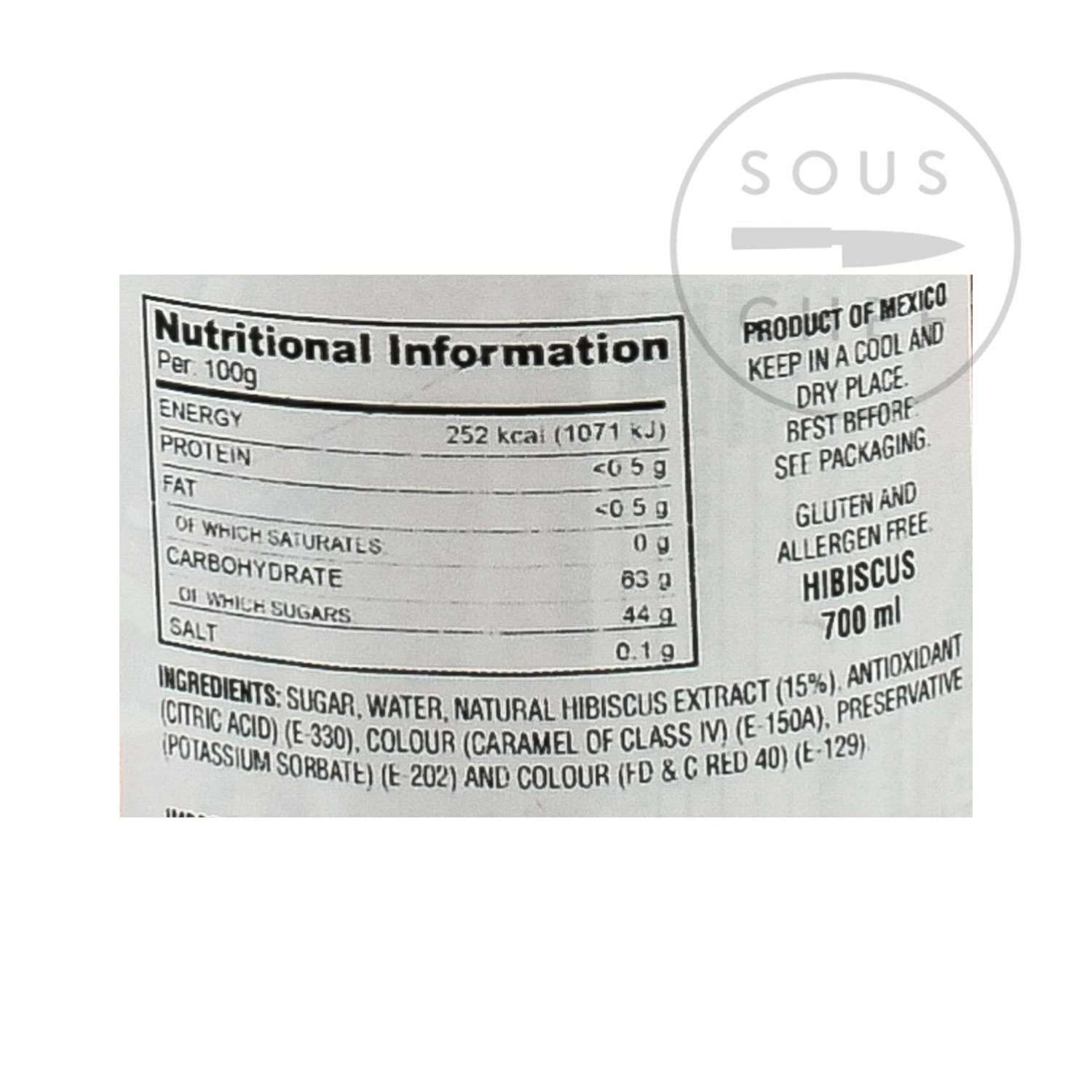 Ingredients: sugar, water, natural hibiscus extract (15%), citric acid, caramel colour E150A, potassium sorbate, red colour E129*.