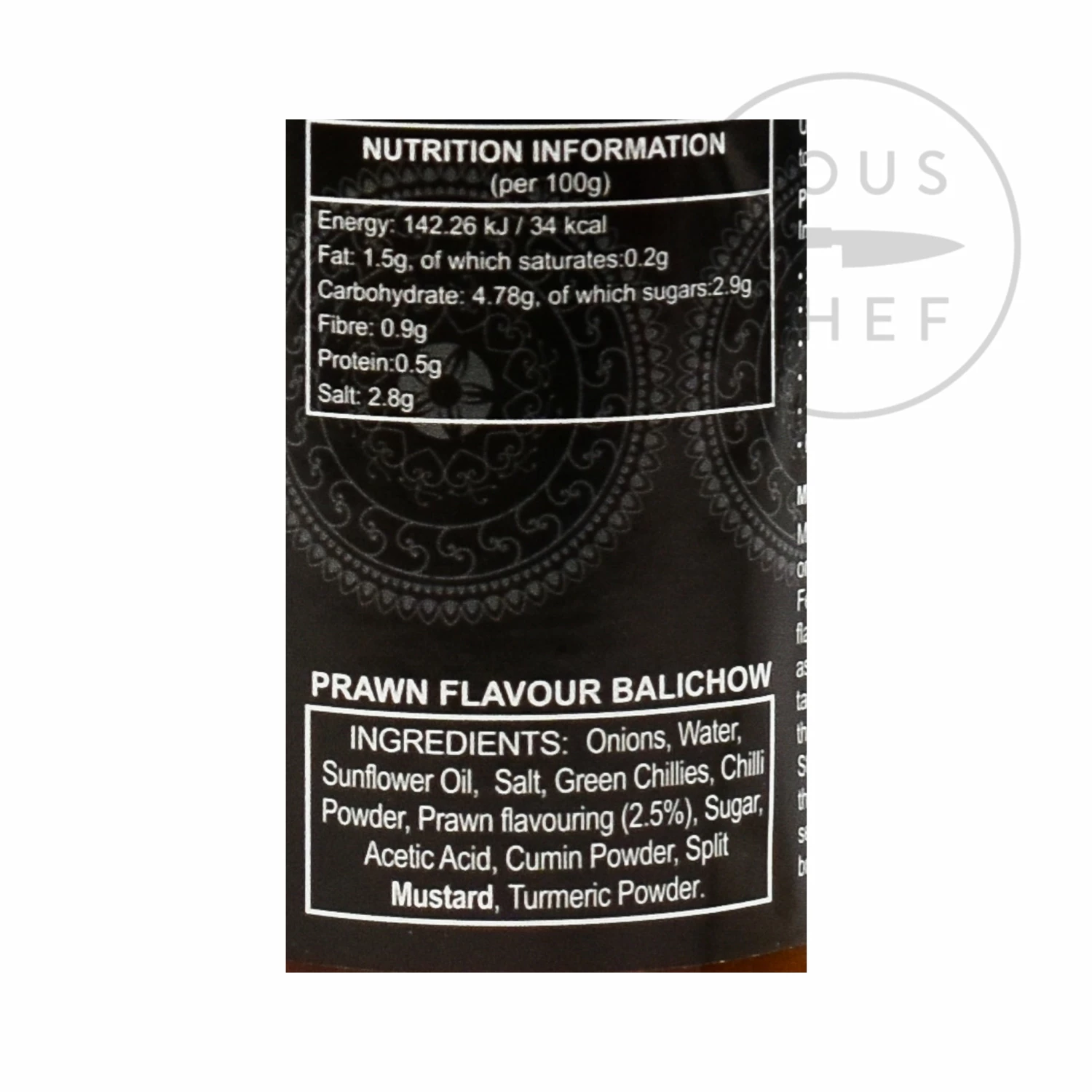 Ingredients: Onions, water, sunflower oil, salt, green chillies, chilli powder, prawn flavouring (2.5%), sugar, acetic acid, cumin powder, split mustard, turmeric powder.