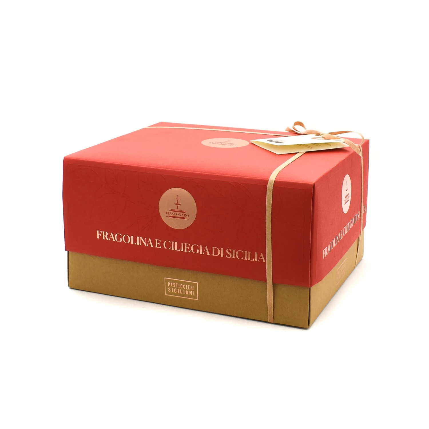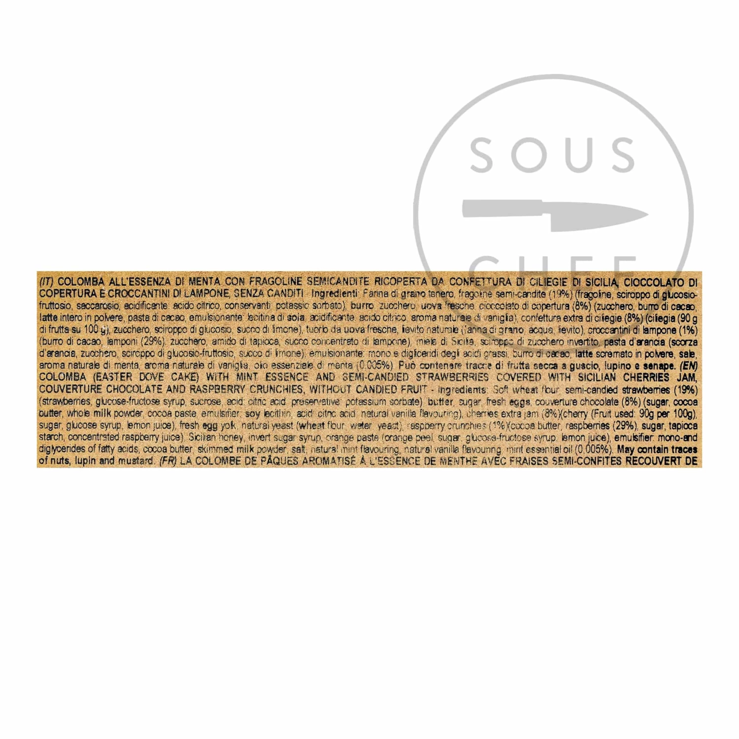 Ingredients: Soft wheat flour, semi candied strawberries (19%) (strawberries, glucose-fructose syrup, sucrose, acid, citric acid, preservative: potassium sorbate), butter, sugar, fresh eggs, couverture chocolate (8%) (sugar, cocoa butter, whole milk powder, cocoa paste, emulsifier: soy lecithin, acid: citric acid; natural vanilla flavouring) cherries extra jam (8%) (cherry (Fruit used 90g per 100g), sugar, glucose syrup, lemon juice), fresh egg yolk, natural yeast (wheat flour, water, yeast), raspberry crunchies (1%) (cocoa butter, raspberries (29%), sugar, tapioca starch, concentrated raspberry juice), Sicilian honey, invert sugar syrup, orange paste (orange peel , sugar, glucose-fructose syrup, lemon juice), emulsifier: mono-and-diglycerides of fatty acids, cocoa butter, skimmed milk powder, salt, natural mint flavouring, natural vanilla flavouring, mint essential oil (0.0005%).Â