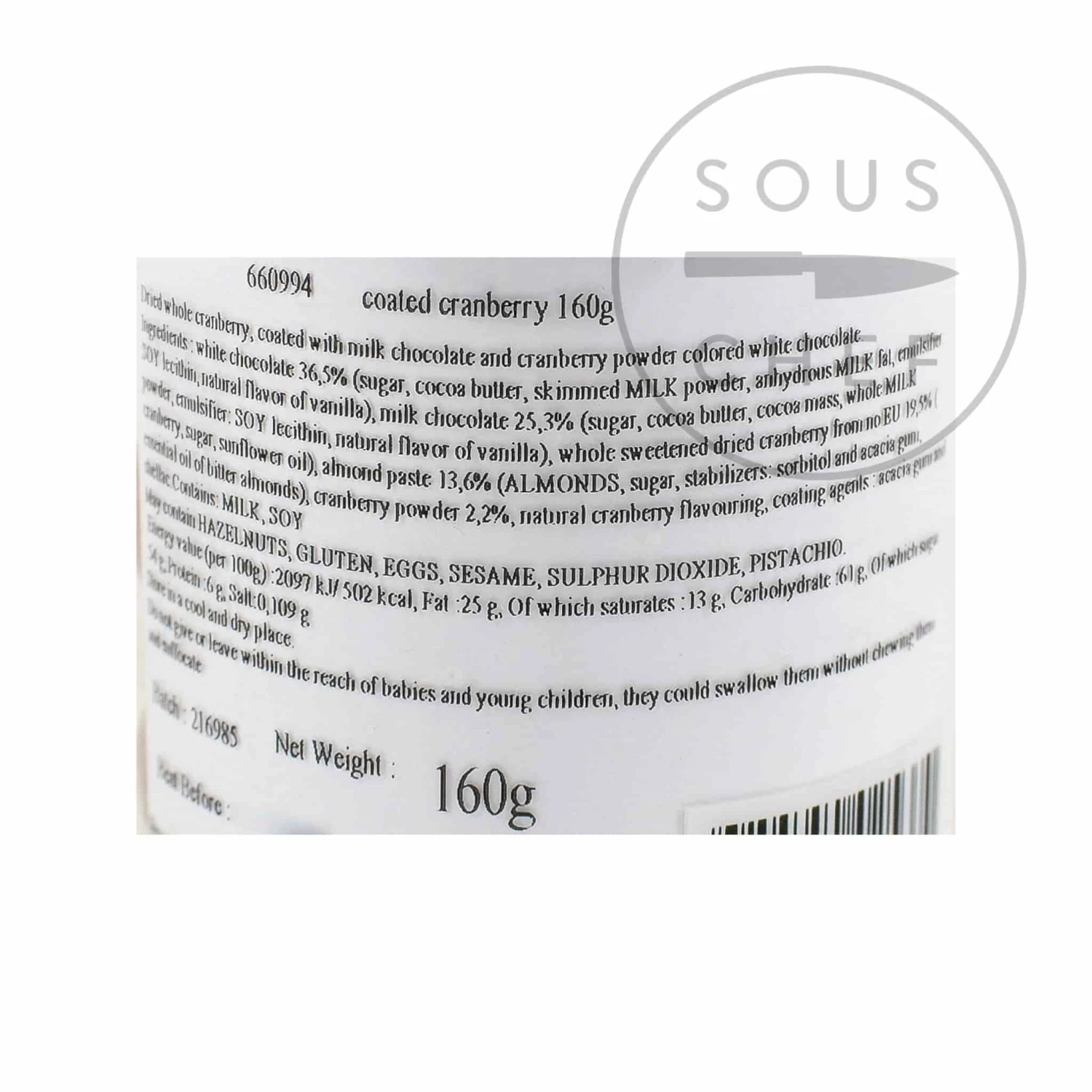 Ingredients: White chocolate 36.5% (sugar, cocoa butter, skimmed milk powder, anhydrous milk fat, emulsifier: soy lecithin, natural flavour of vanilla), milk chocolate 25.3% (sugar, cocoa butter, cocoa mass, whole milk powder, emulsifier: soy lecithin, natural flavour of vanilla), whole sweetened dried cranberry 19.5% (cranberry, sugar, sunflower oil), almond paste 13.6% (almonds, sugar, stabilizers: sorbitol and acacia gum, essential oil of bitter almonds), cranberry powder 2.2%, natural cranberry flavouring, coating agents: acacia gum.