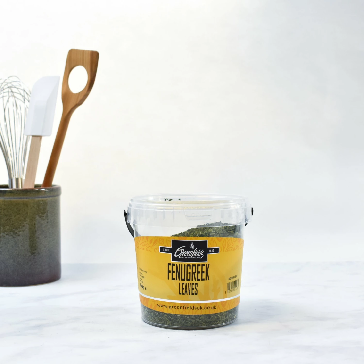Fenugreek leaves from Greenfields, a second generation UK-based family business. Greenfields’ herbs and spices are used by restaurants, artisans and street food producers across the country – all who enjoy their great value, kitchen-safe and easy-to-use resealable plastic tubs for their ingredients. Their philosophy is to provide good quality products at a great price.