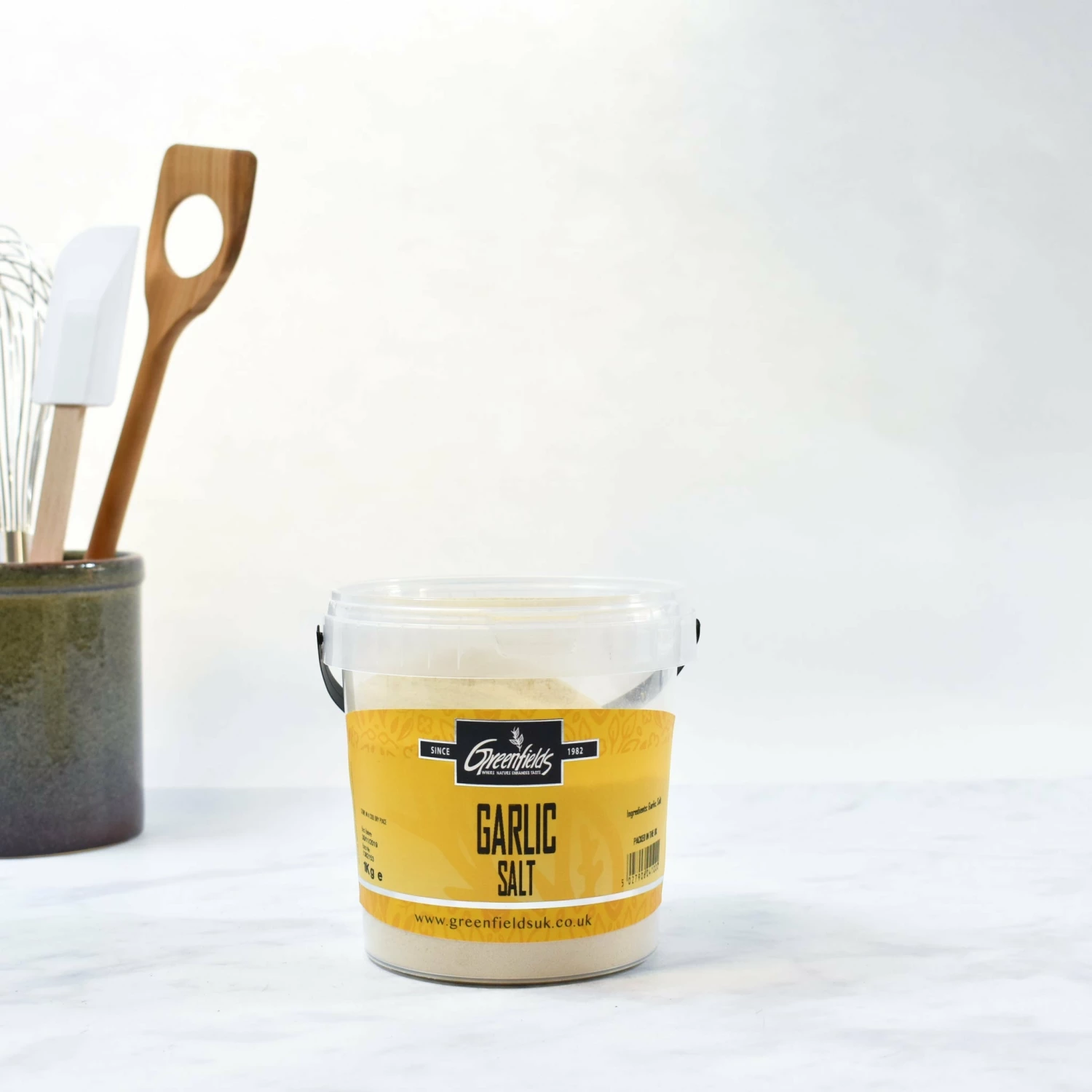 Garlic salt from Greenfields, a second generation UK-based family business. Greenfields’ herbs and spices are used by restaurants, artisans and street food producers across the country – all who enjoy their great value, kitchen-safe and easy-to-use resealable plastic tubs for their ingredients. Their philosophy is to provide good quality products at a great price.