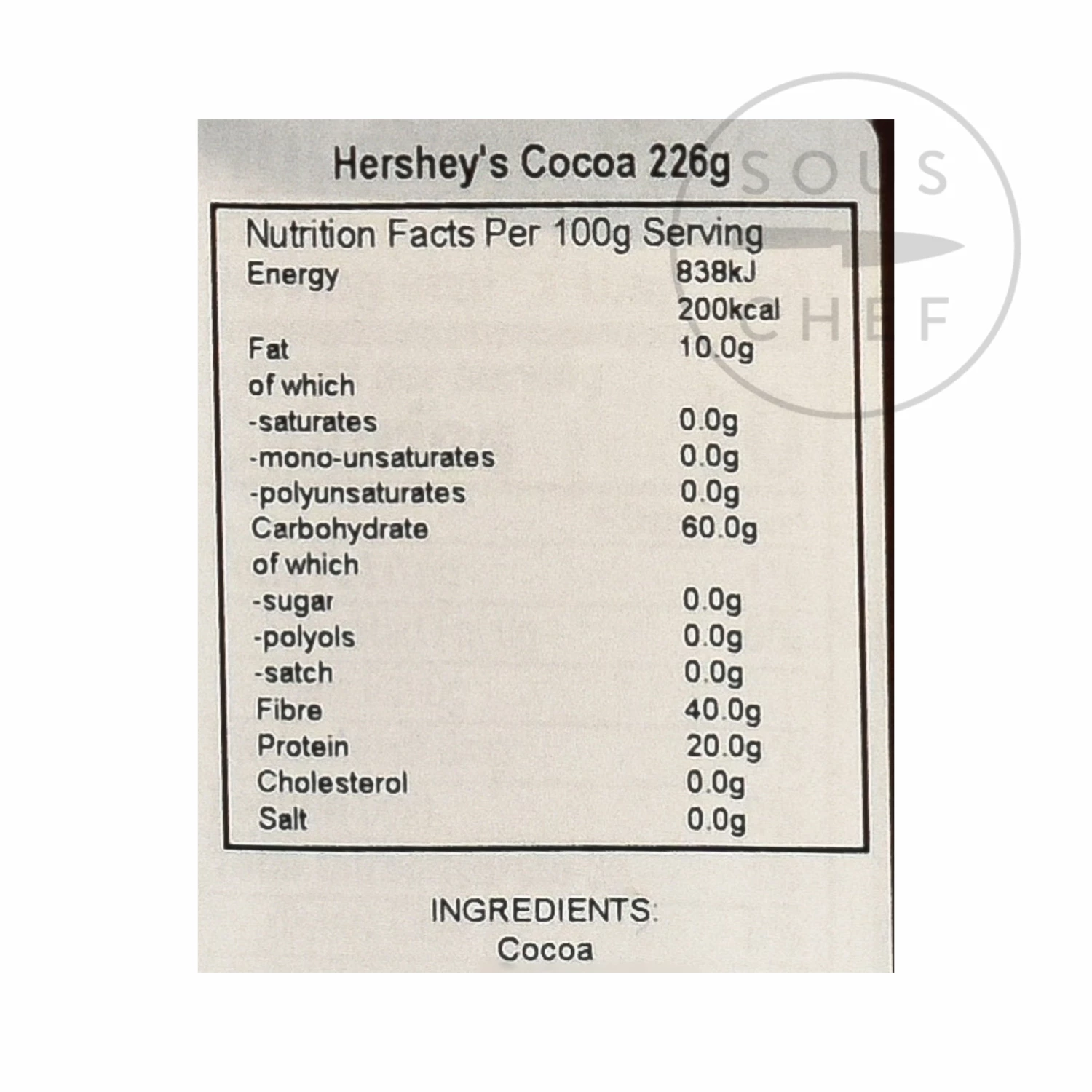 The recipes on the packet of Hershey’s cocoa powder include chocolate cake and ‘perfectly chocolate’ frosting. One 5g serving contains just 10 calories and 0.5g of fat, meaning that Hershey’s cocoa powder is also a great variety to use in hot cocoas, and as an all-American brand, is also perfect for a Devil’s Food Cake.Â