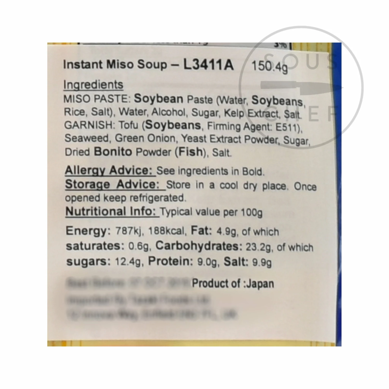 Ingredients: Soup base soybean paste (soybean, rice, salt), water, alcohol, monosodium glutamate, bonito extract (fish), disodium inosinate Garnish tofu (soybean, tapioca starch), seaweed, green onion, bonito extract granule (glucose, monosodium glutamate, salt, bonito powder, disodium inosinate, disodium guanylate, disodium succinate). Contains soya, fish.Â