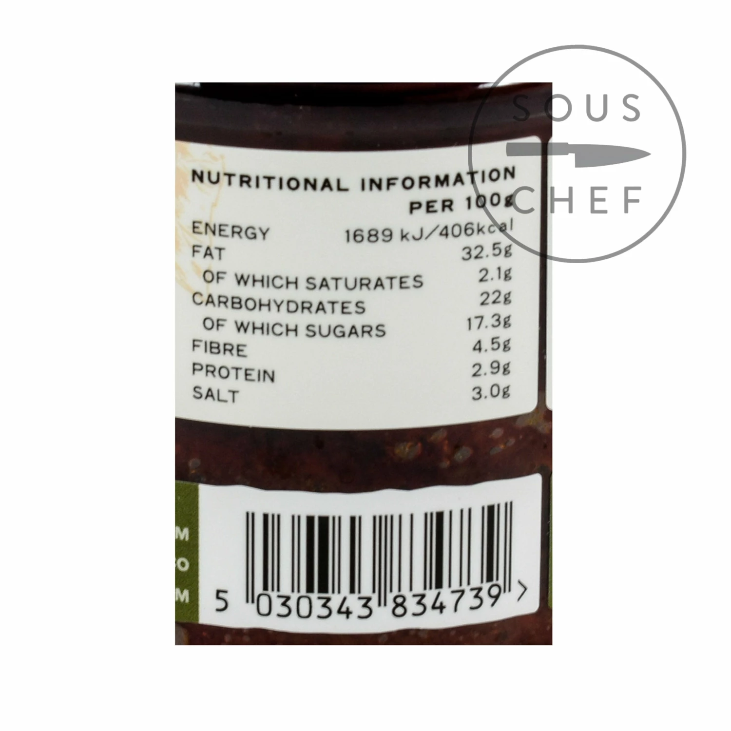 Ingredients: Sunflower oil, rehydrated paprika and cayenne peppers (23%), raisins, dried apricots (13%), capers, garlic, balsamic vinegar of Modena (cooked grape must, wine vinegar), salt, mixed spices, rice flour, rose petals, ras el hanout (ginger, turmeric, cumin, cardamom, clove, cinnamon, nutmeg), acidity regulator: citric acid.