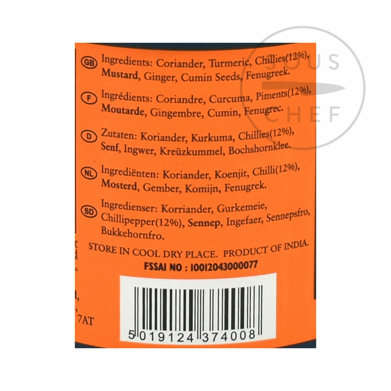 Ingredients: Coriander, turmeric, mustard, chilli (12%), ginger, cumin, fenugreek. Allergens listed in bold.