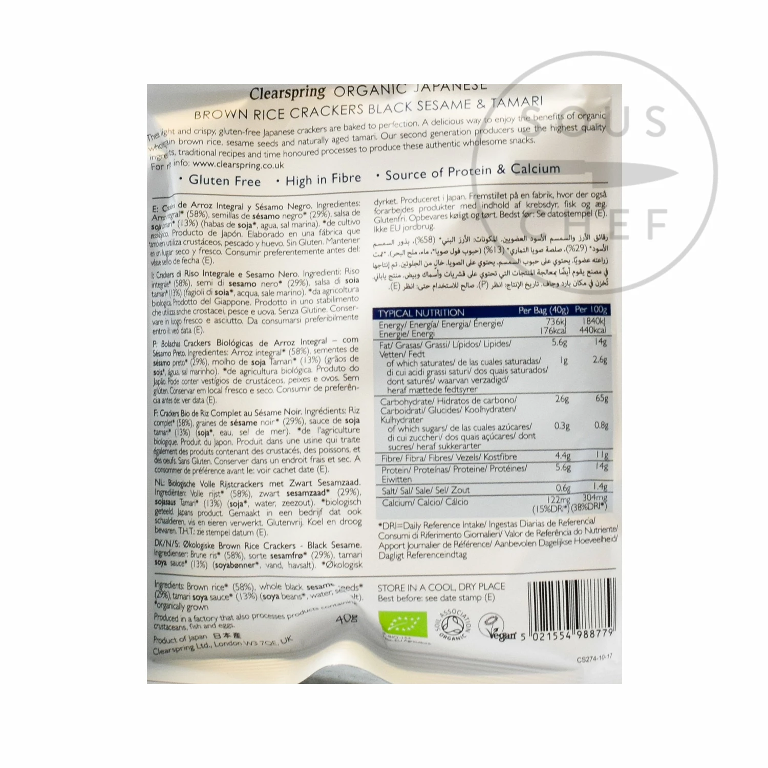 Ingredients: Organic brown rice (58%), organic whole black sesame seeds (29%), organic tamari soya sauce (organic soya beans, water, sea salt).