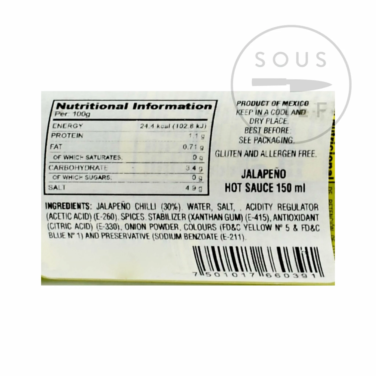 Ingredients: Green jalapeño peppers (30%), water, salt, acetic acid E360, spices, xanthan gum E415, citric acid E330, onion powder, yellow and blue colourings, sodium benzoate E211.