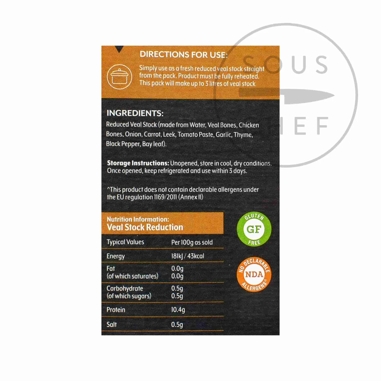 Ingredients: reduced veal stock (made from water, veal bones, chicken bones, onion, carrot, leek, tomato paste, garlic, thyme, black pepper, bay leaf).