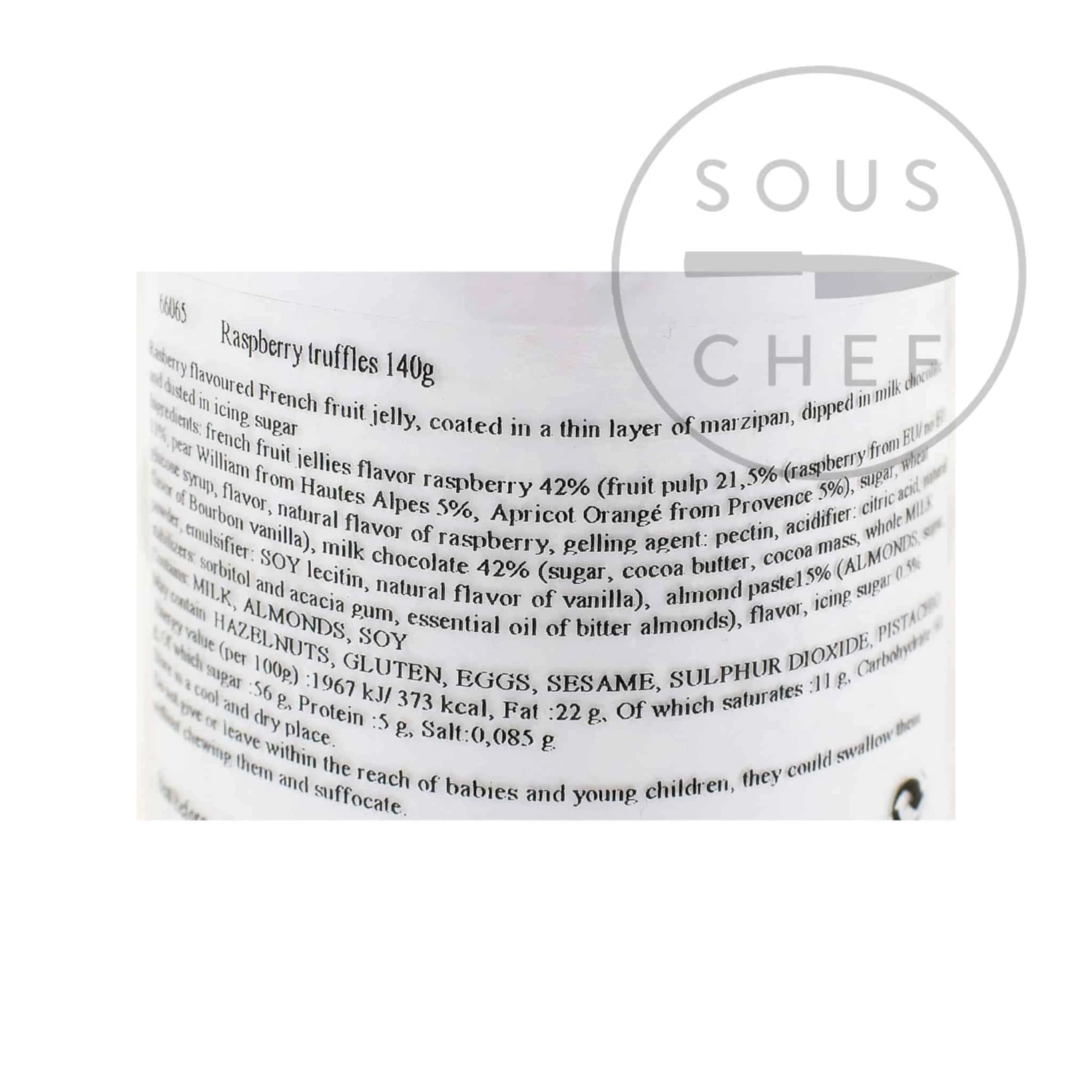 Ingredients: Raspberry flavour fruit paste 42% (fruit pulp 21.5% (raspberry origin EU / non-EU 11%, William pear from Hautes Alpes 5%, apricot Orange de Provence 5%), sugar, wheat glucose syrup, aroma, natural raspberry flavour, gelling agent: pectin, acidifier: citric acid, natural Bourbon vanilla flavour), milk chocolate 42% (sugar, cocoa butter, cocoa mass, whole milk powder, emulsifier: soya lecithin, natural vanilla flavour), marzipan 15% (almonds, sugar, stabilizers: sorbitol and acacia gum, bitter almond essential oil), flavour, icing sugar 0.5%.