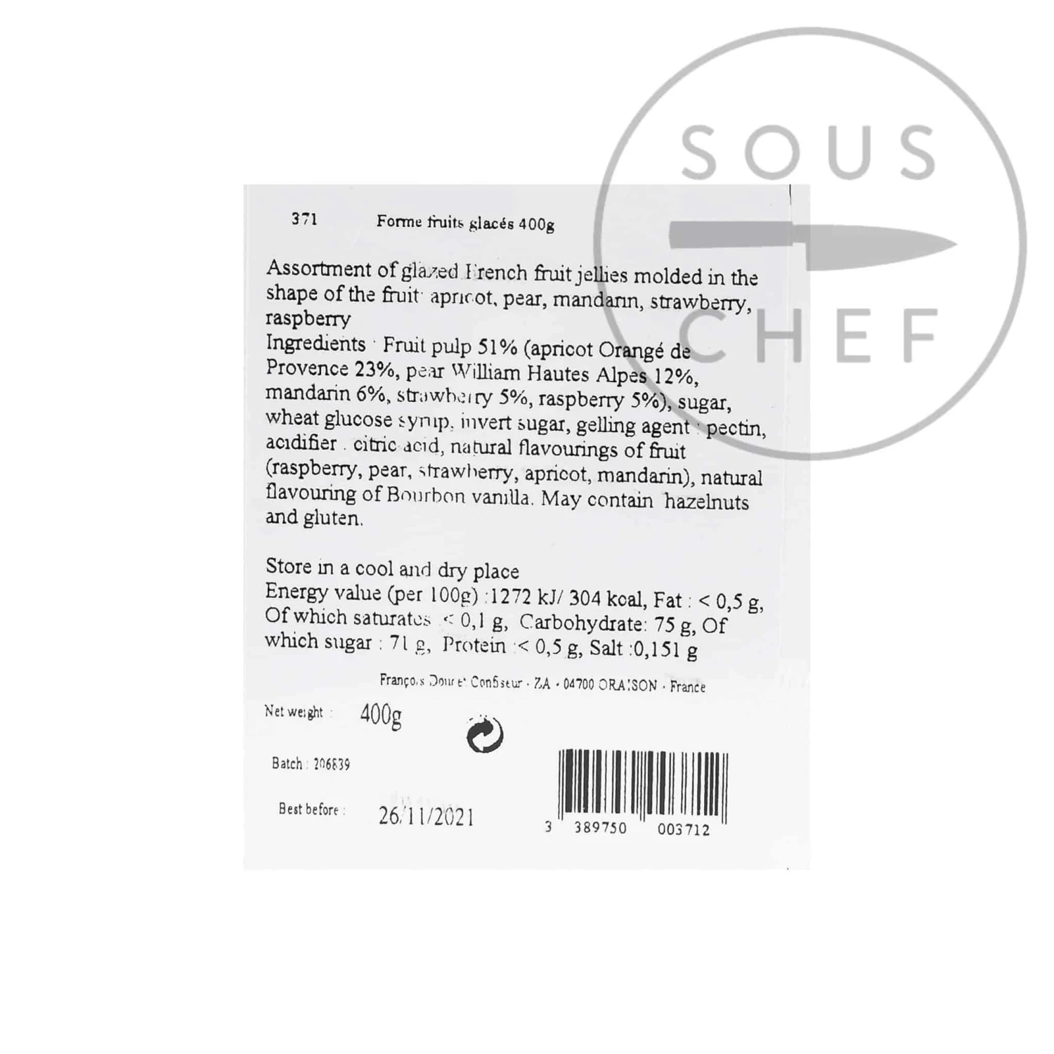 Ingredients: Fruit pulp 51% (apricot ‘Orange de Provence’ 23%, pear ‘William Hautes Alpes’ 12%, mandarin 6%, strawberry 5%, raspberry 5%) sugar, wheat glucose syrup, invert syrup, gelling agent: pectin, acidifier: citric acid, natural flavouring of fruit (raspberry, pear, strawberry, apricot, mandarin), natural flavour of Bourbon vanilla. May contain hazelnuts and gluten. Allergens listed in bold.