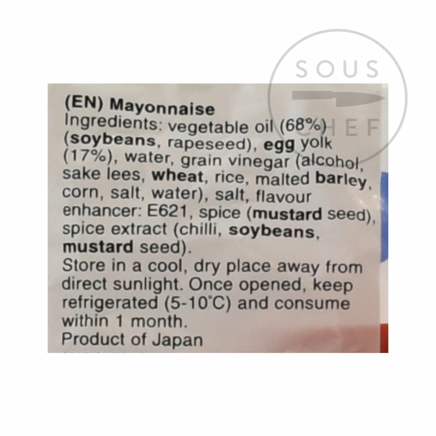 Ingredients: Vegetable oil (soybeans and rapeseed), egg yolk, water, vinegar (alcohol, sake lees, wheat, rice, malted barley, corn, salt, water), salt, flavour enhancer E621, spice (mustard seed), spice extract (chilli, soybeans, mustard seed). Allergens are listed in bold.Â
