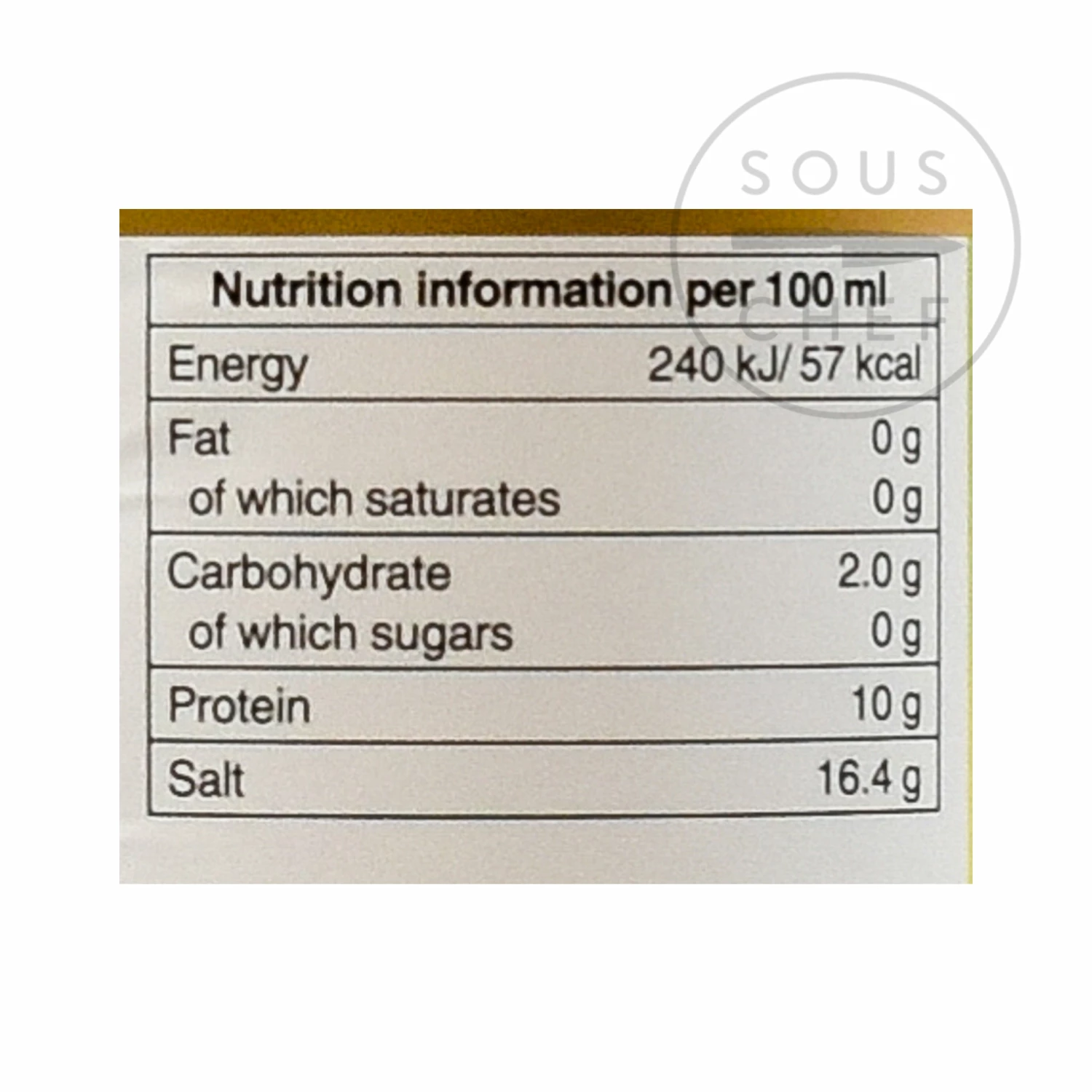 Ingredients: water, soybeans, salt, spirit vinegar. Contains allergens: soya. Once opened, keep refrigerated.