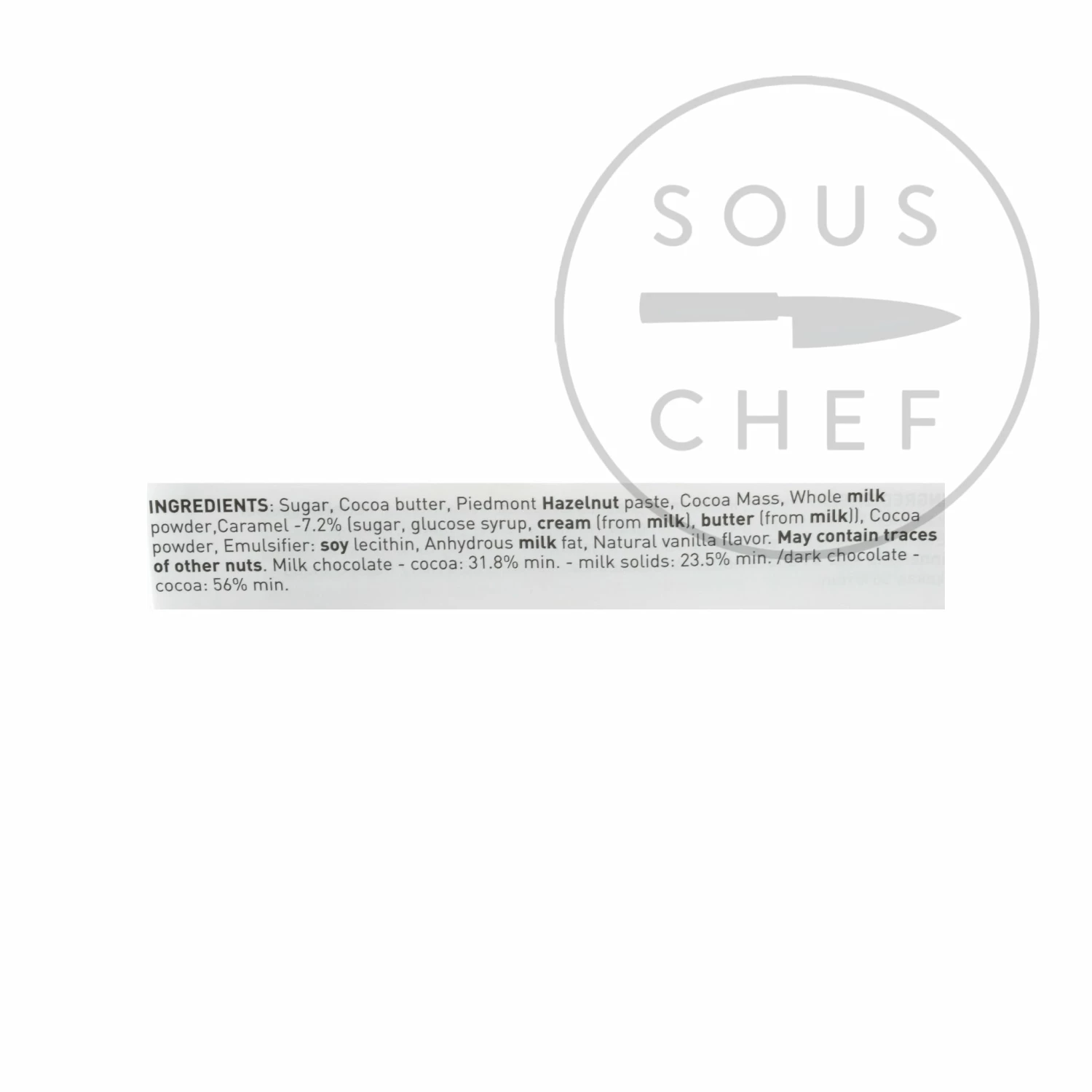 Ingredients: Sugar, cocoa butter, Piedmont hazelnut paste, cocoa mass, whole milk powder, caramel – 7.2% (sugar, glucose syrup, cream (from milk), butter (from milk)), cocoa powder, emulsifier: soy lecithin, anhydrous milk fat, natural vanilla flavour.