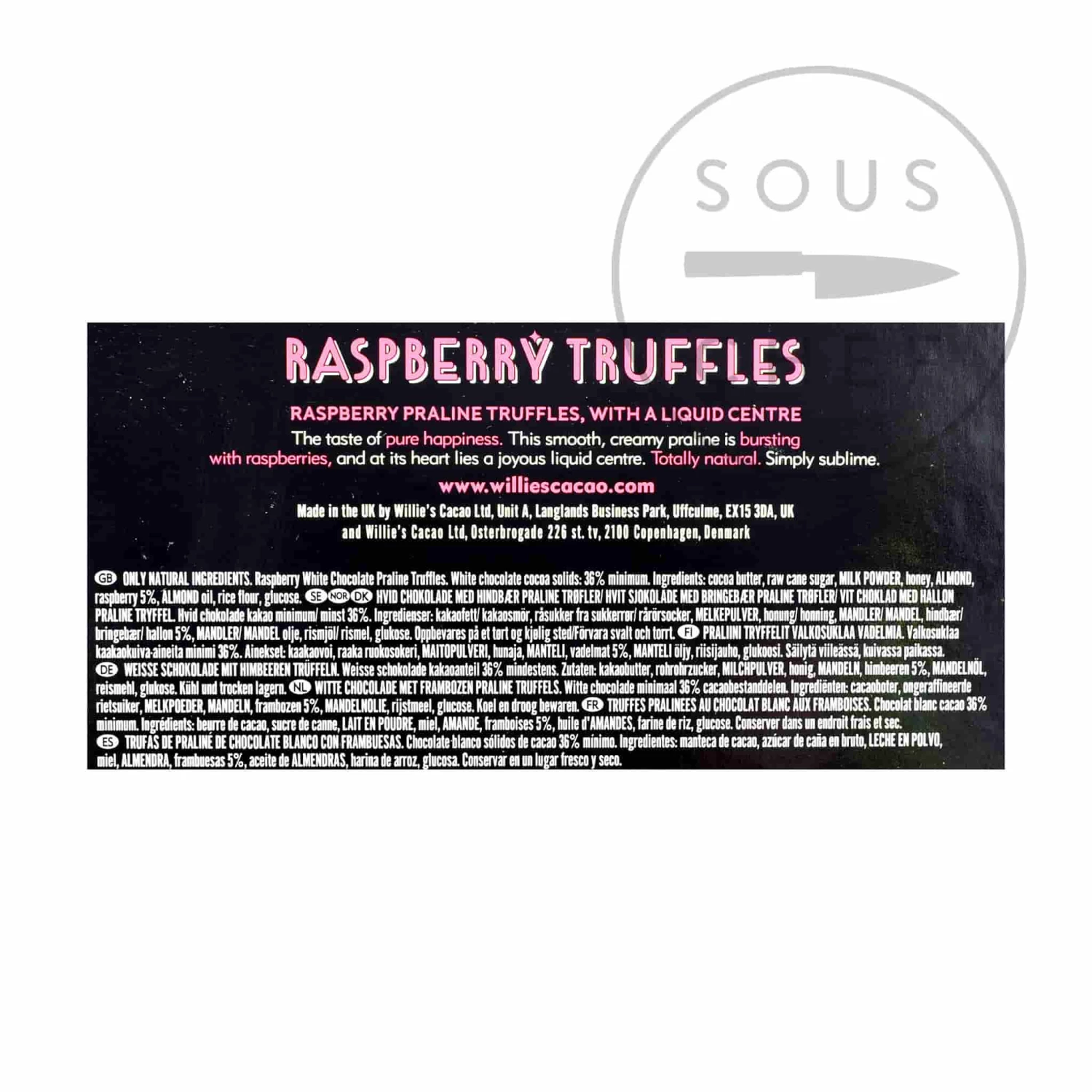 Willie’s Cacao liquid centre raspberry truffles are a luxurious treat – serve with your afternoon espresso or as after-dinner petit fours. A creamy white chocolate praline shell encases a zingy raspberry centre – a true delight for those that love fruity chocolate.