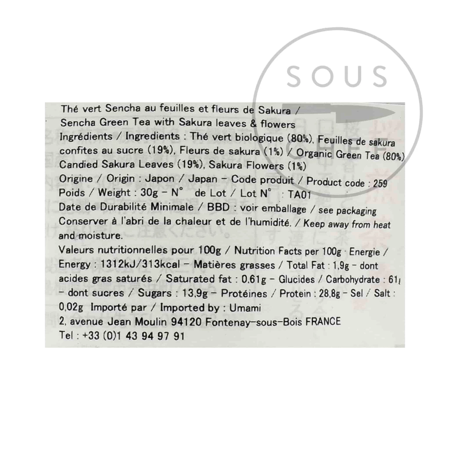 Ingredients: organic green tea (80%), candied sakura leaves (19%), sakura flowers (1%).