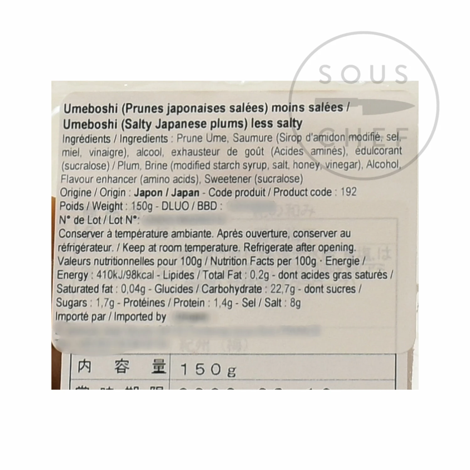 Ingredients: Plum, brine, (modified starch syrup, salt, honey vinegar) alcohol, flavour enhancer (amino acid), sweetener (sucralose). No artificial colouring added.