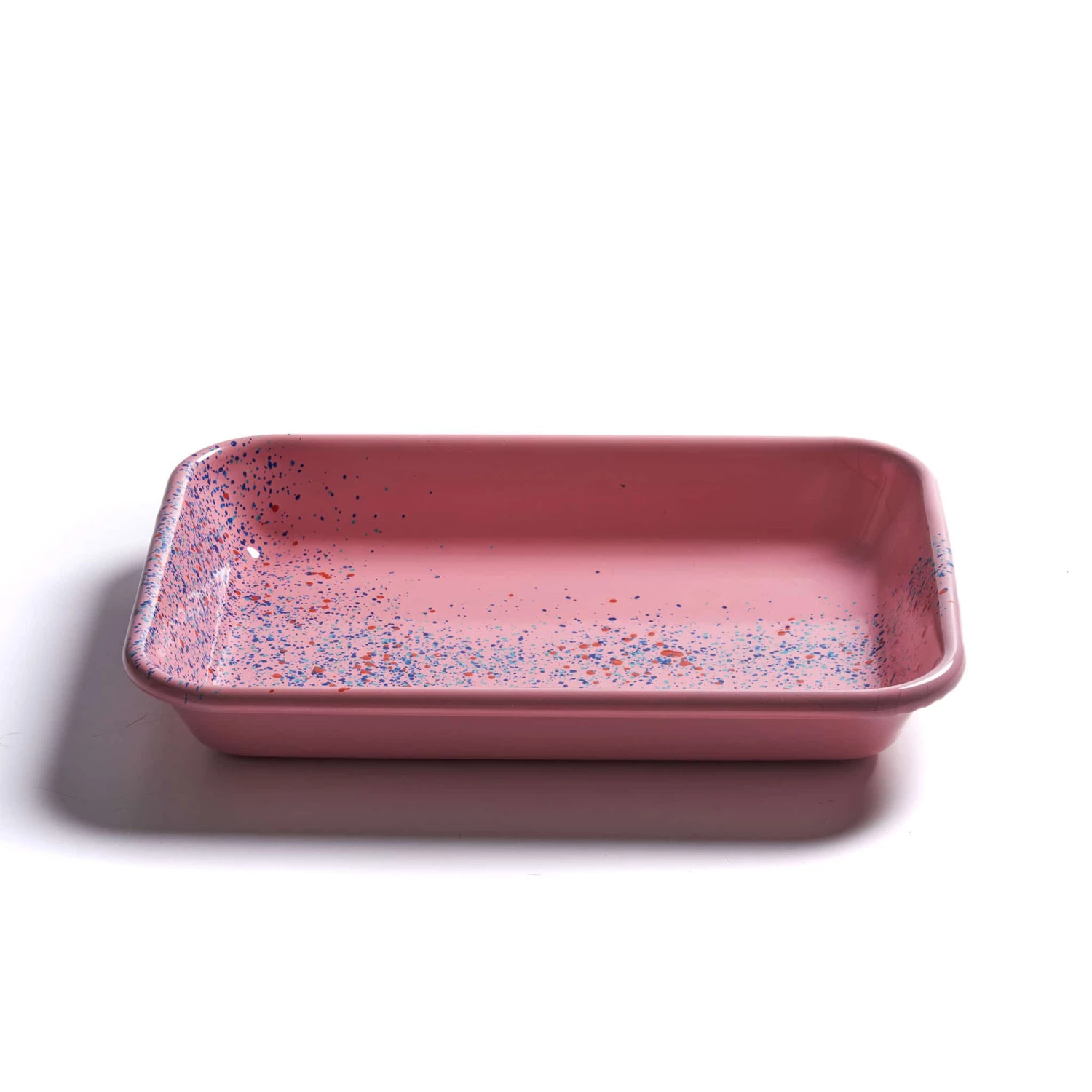 The Splatter Fest enamel roasting and serving dish in pink is a striking way to serve root vegetable gratins and truffled macaroni cheese. The pink dish is adorned with a splatter style design in shades of red, purple and teal blue. This incredibly versatile dish can be used in the oven and on the hob – serve from oven-to-table in style.