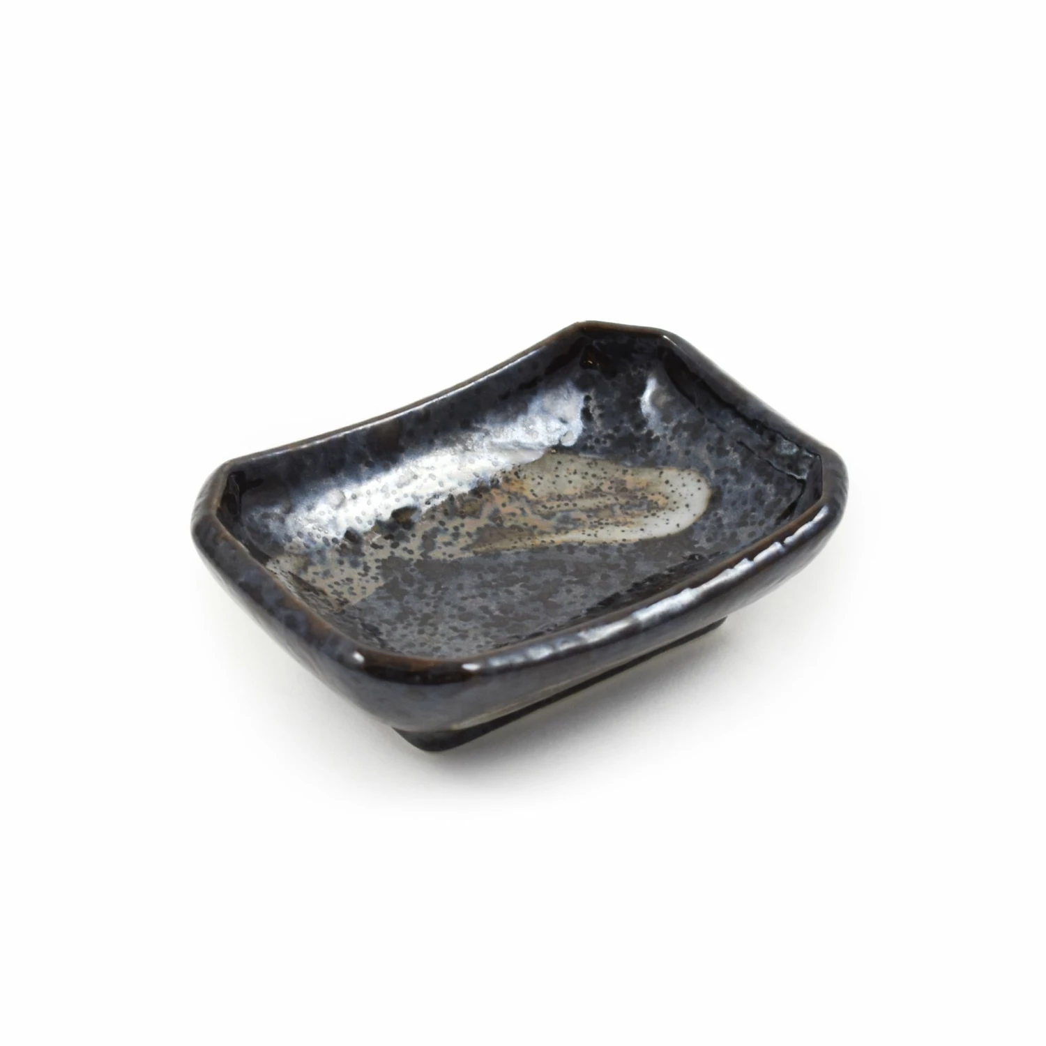“Karasuba-iro” means glossy black in Japanese, and this glazed ceramic sauce dish has a beautiful glossy black and grey speckled surface. Additional red-brown detailing and white sweeps add to the elegance of the design.