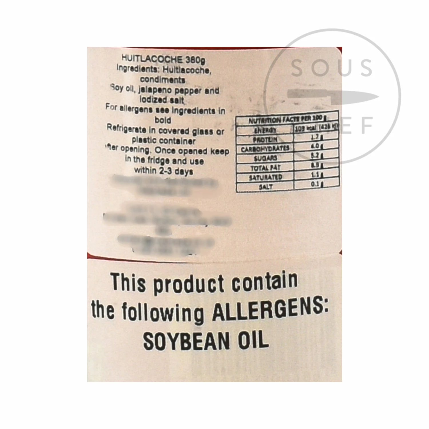 Ingredients: cuitlacoche, onion, soya oil, jalapeno pepper, salt.