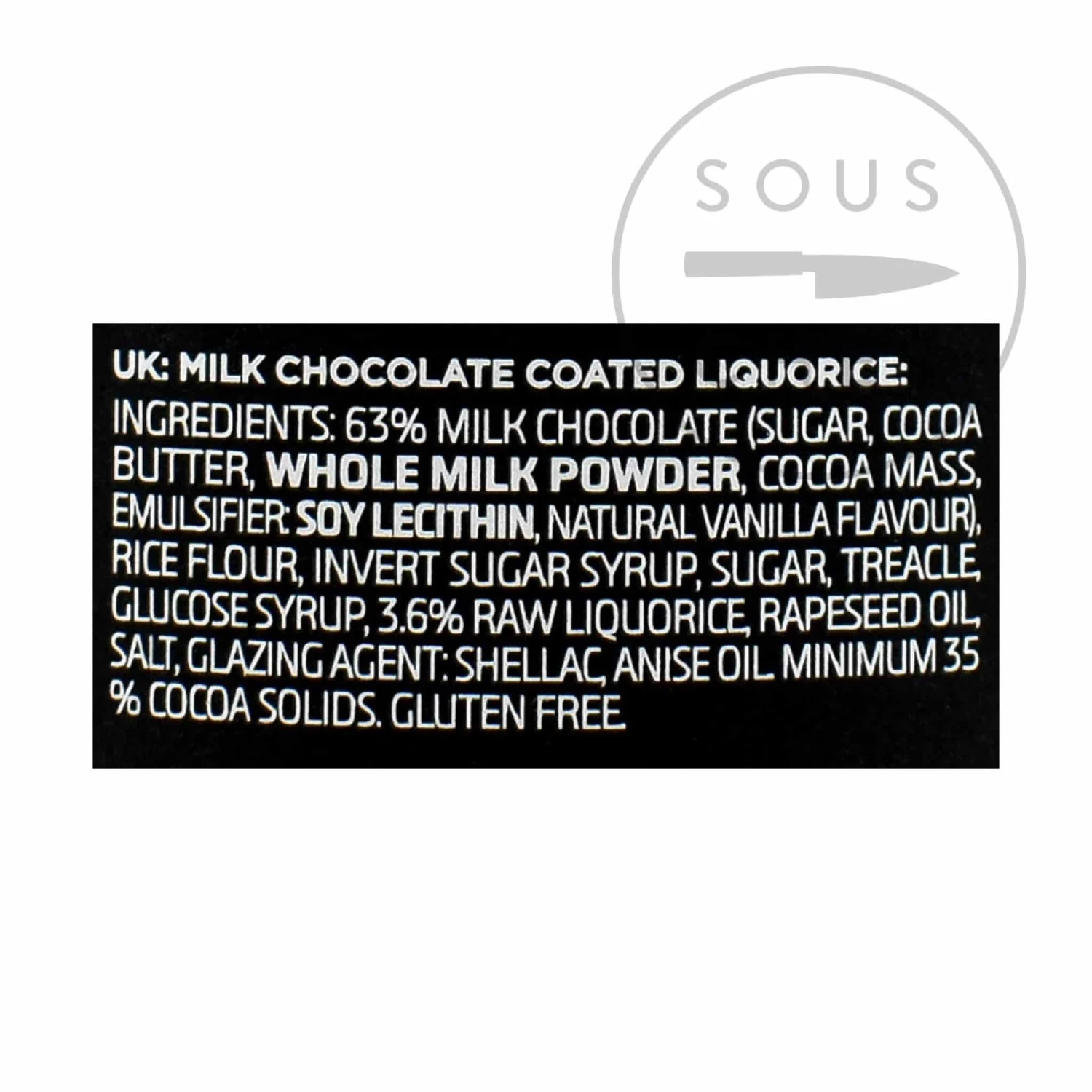 Lakrids A: 63% milk chocolate (sugar, cocoa butter, whole milk powder, cocoa mass, emulsifier: soy lecithin, natural vanilla flavouring), rice flour, invert sugar syrup, sugar, treacle, glucose syrup, 3.6% raw liquorice, rapeseed oil, salt, anise oil, glazing agent: shellac. Minimum 35% cocoa solids. Gluten free.
