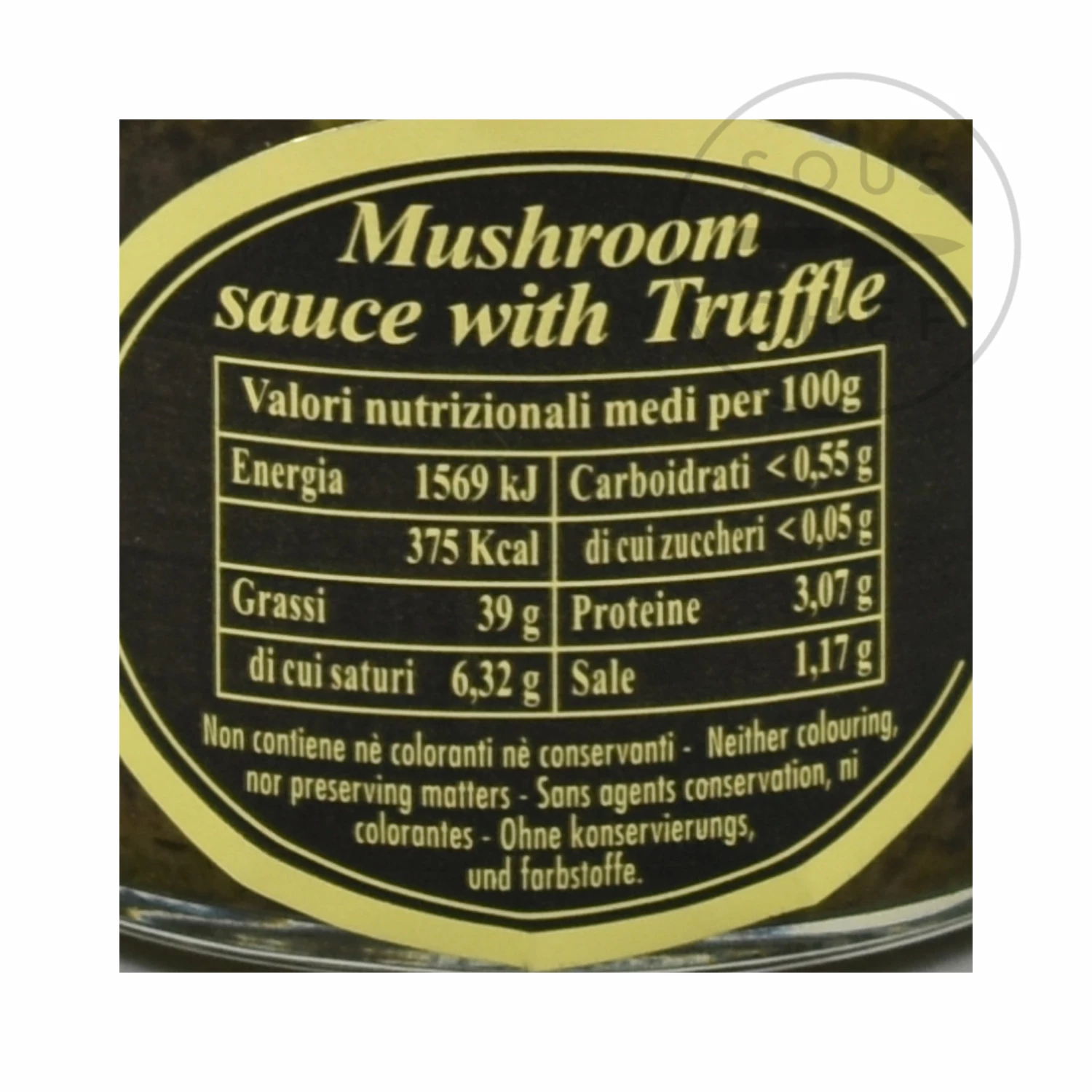 Ingredients: mushrooms (Agaricus bisporus)70%, extra virgin olive oil, summer truffle (tuber aestivum vitt) 3%, lemon juice, salt, aromatic herbs, spices, natural flavourings, aromas. May contain traces of gluten, milk, nuts and anchovies.